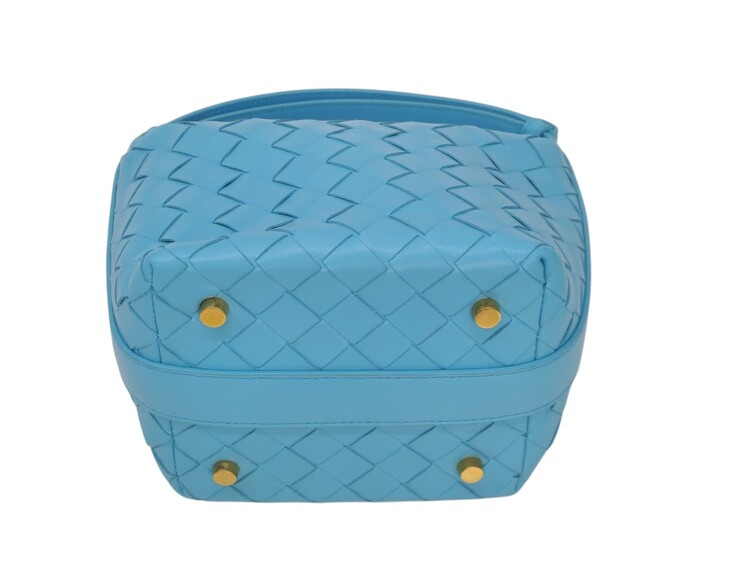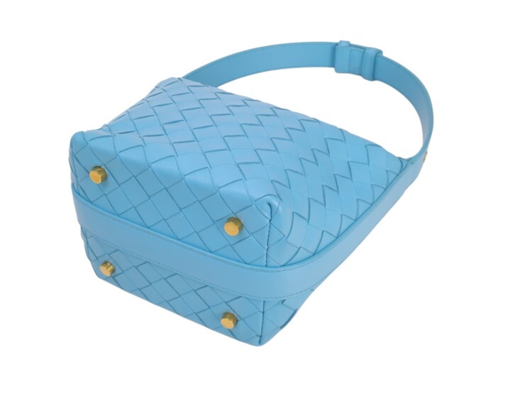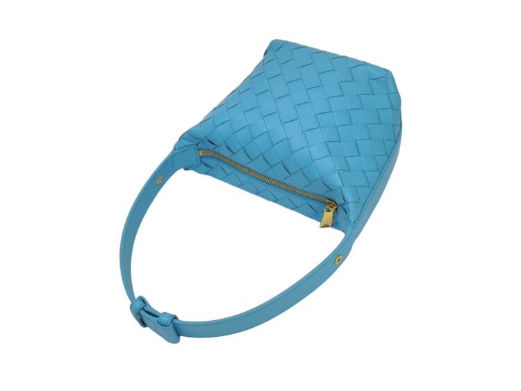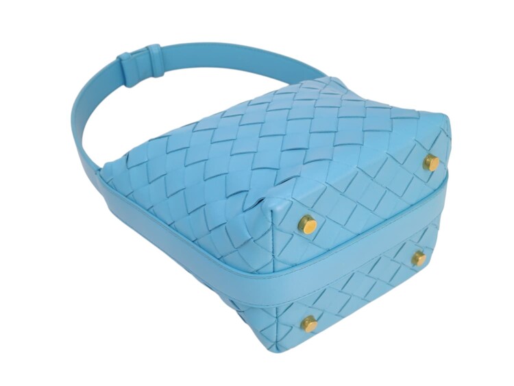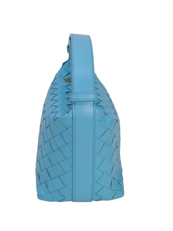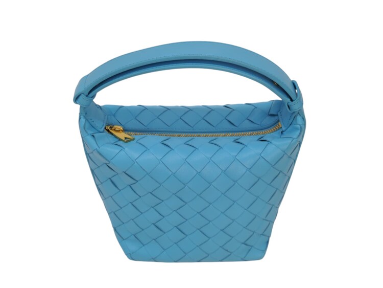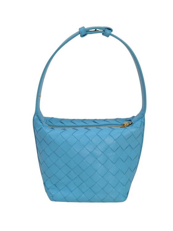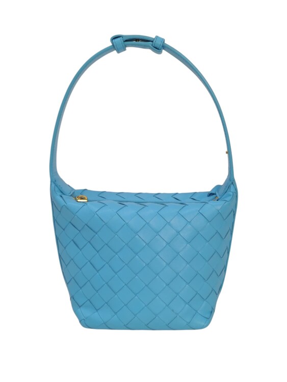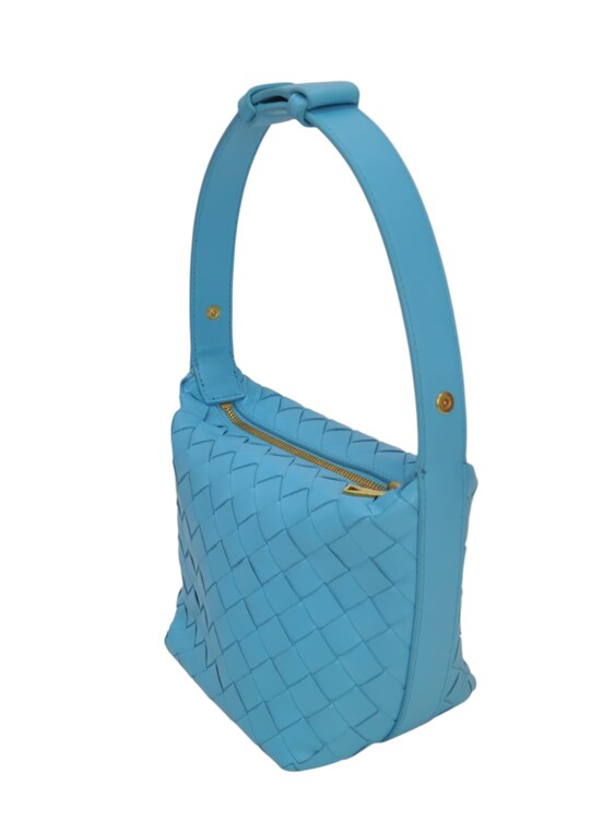 Bottega Veneta Candy Wallace nella colorazione azzurro, in pelle micro intrecciata. Chiusura con cerniera e fodera in pelle. Manico regolabile. Colore introvabile.