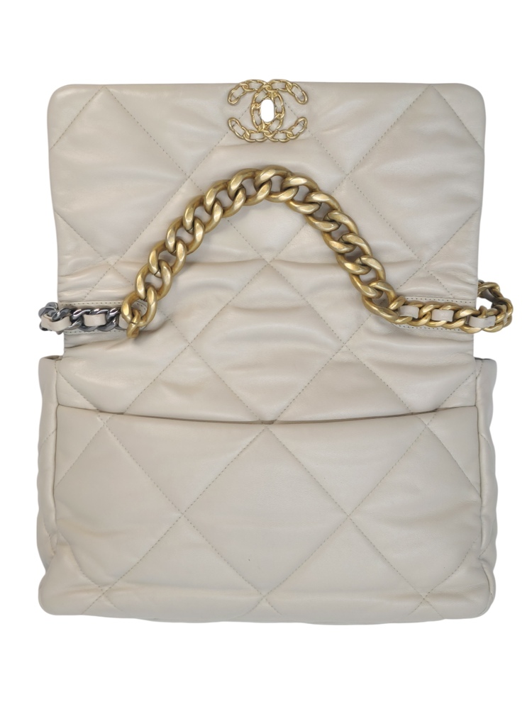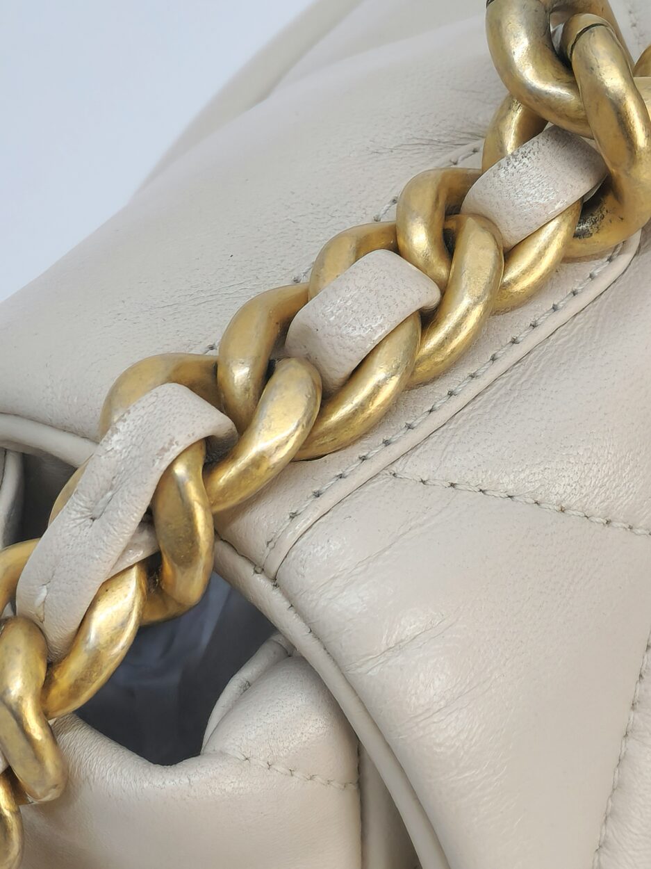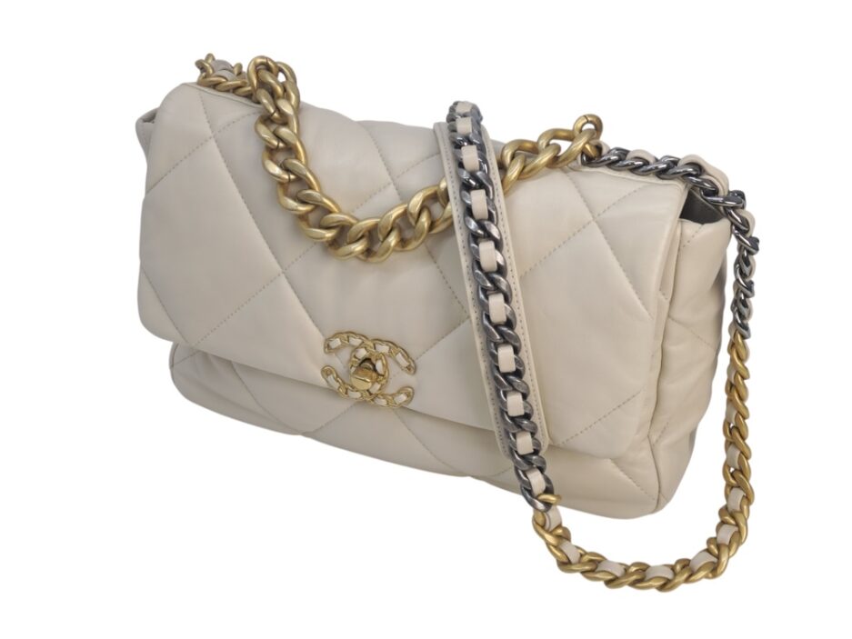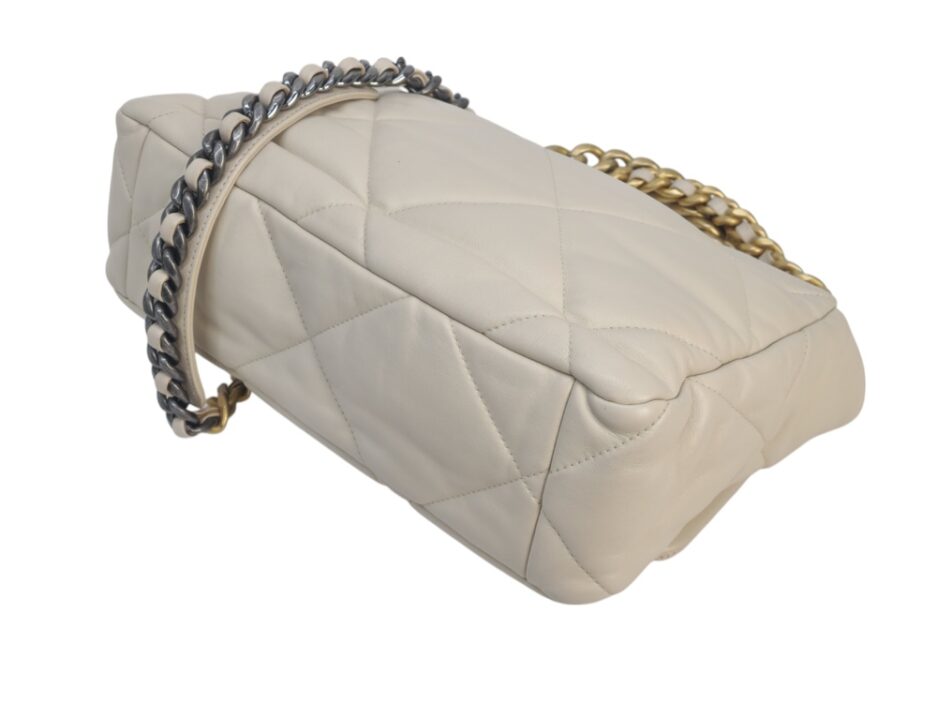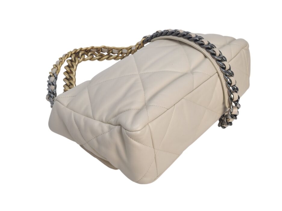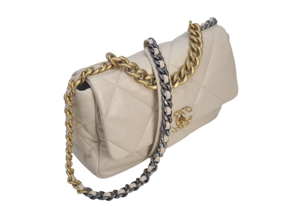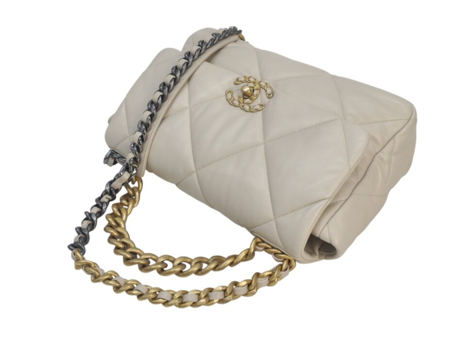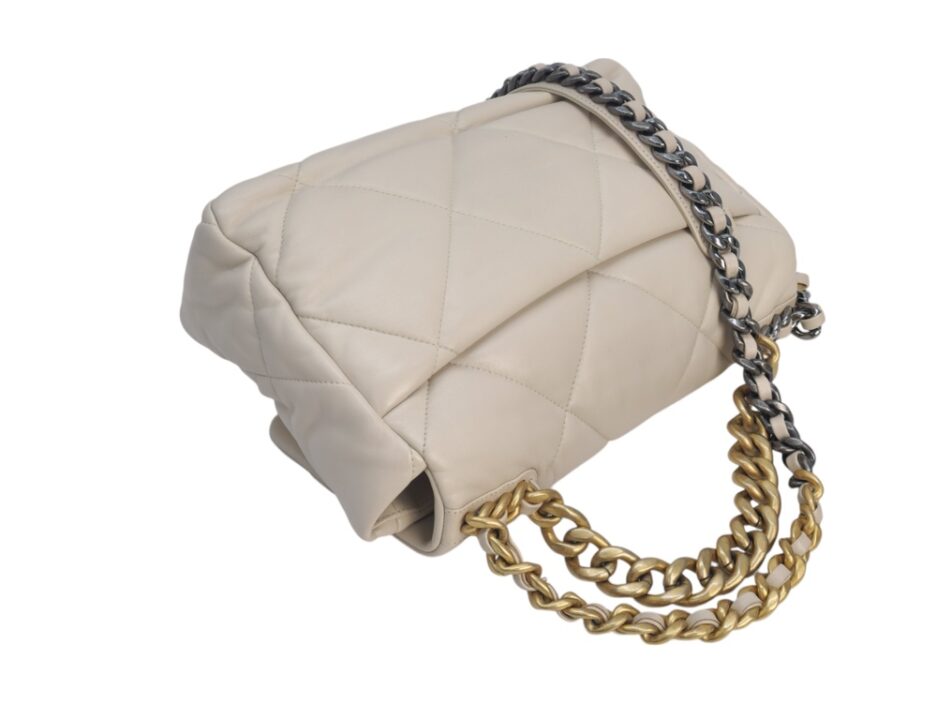 Chanel 19 Medium in pelle nella colorazione Ecrù , con hardware dorato. La borsa presenta una tracolla con rifiniture in metallo argentato e dorato alternate.