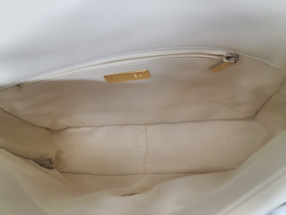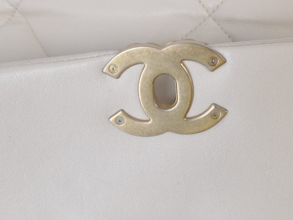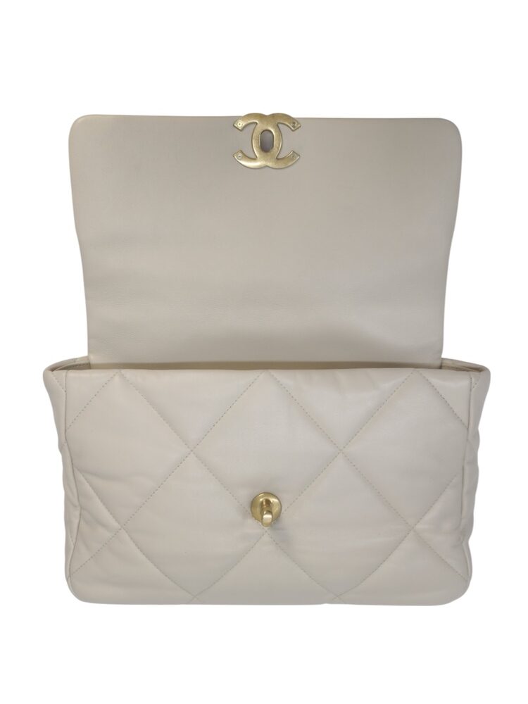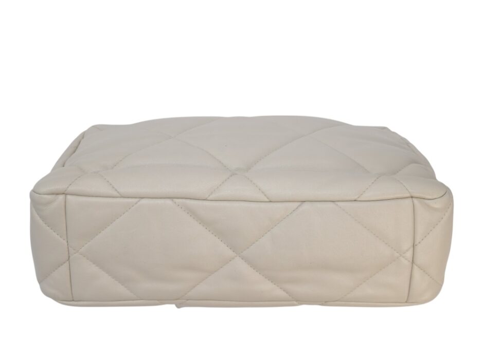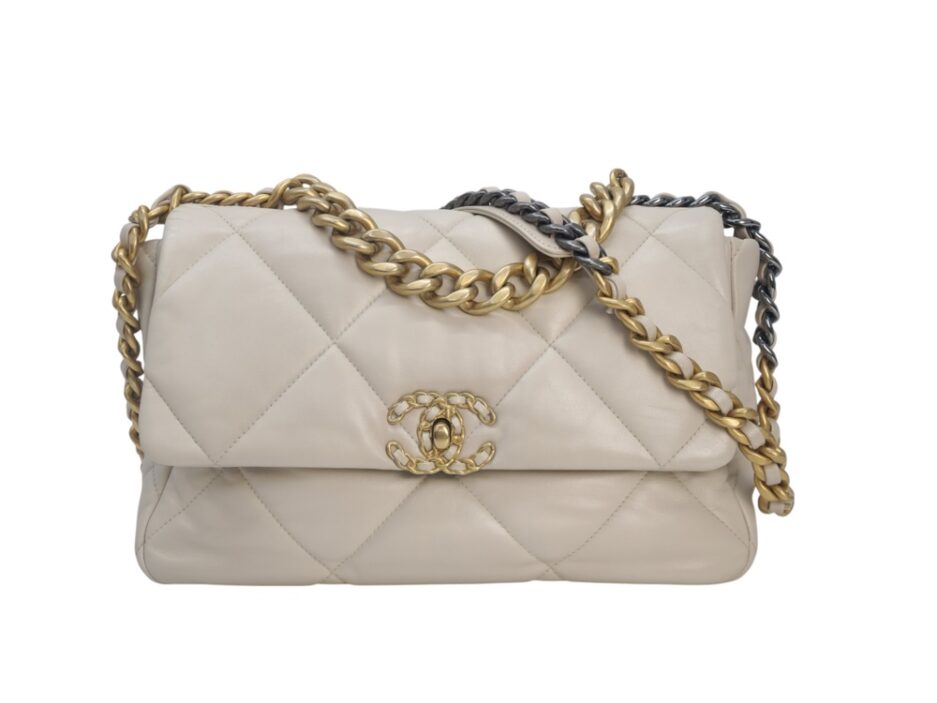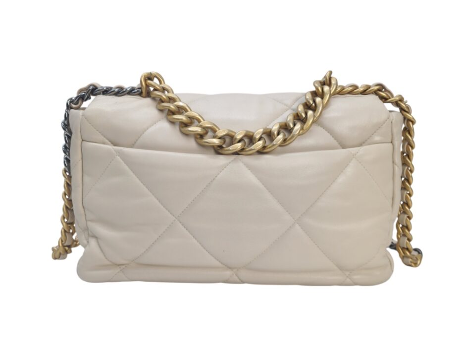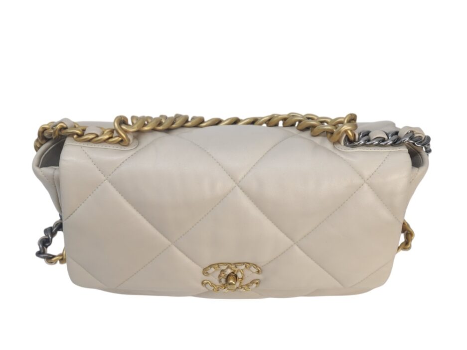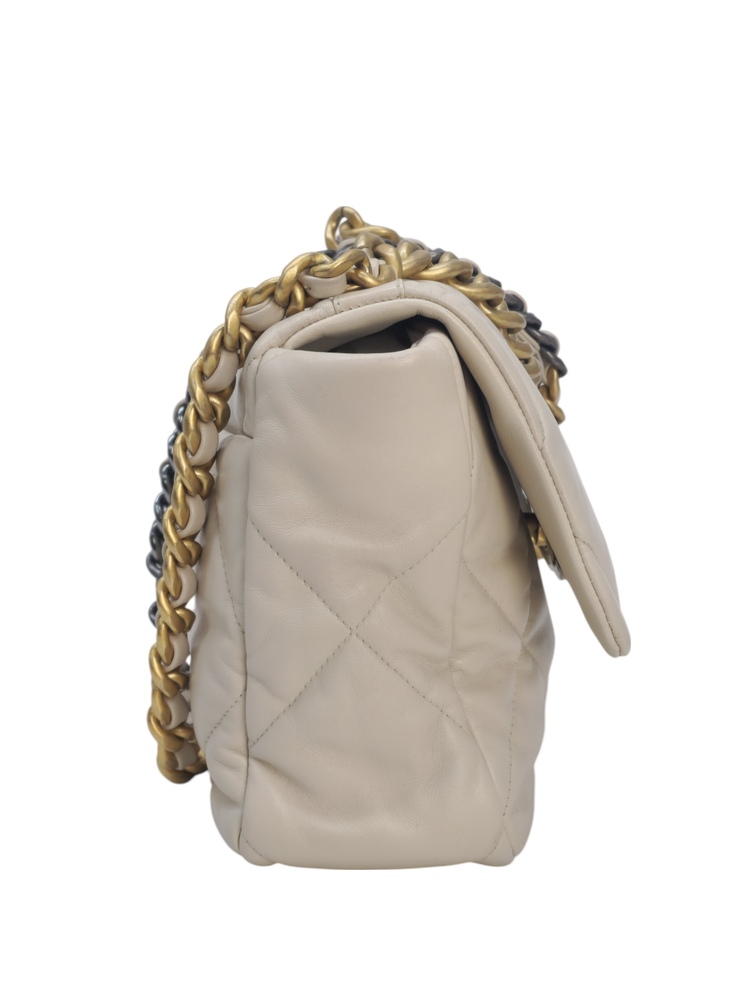 Chanel 19 Medium in pelle nella colorazione Ecrù , con hardware dorato. La borsa presenta una tracolla con rifiniture in metallo argentato e dorato alternate.