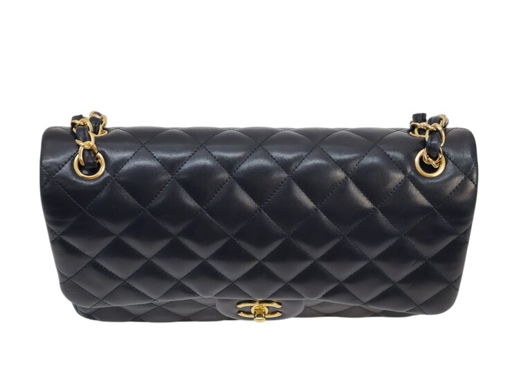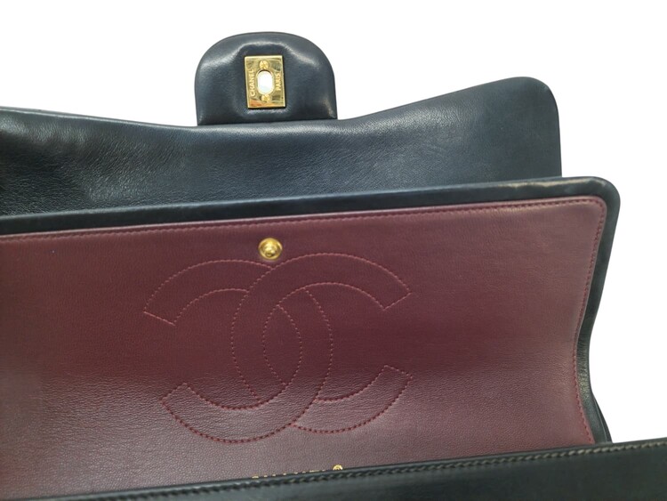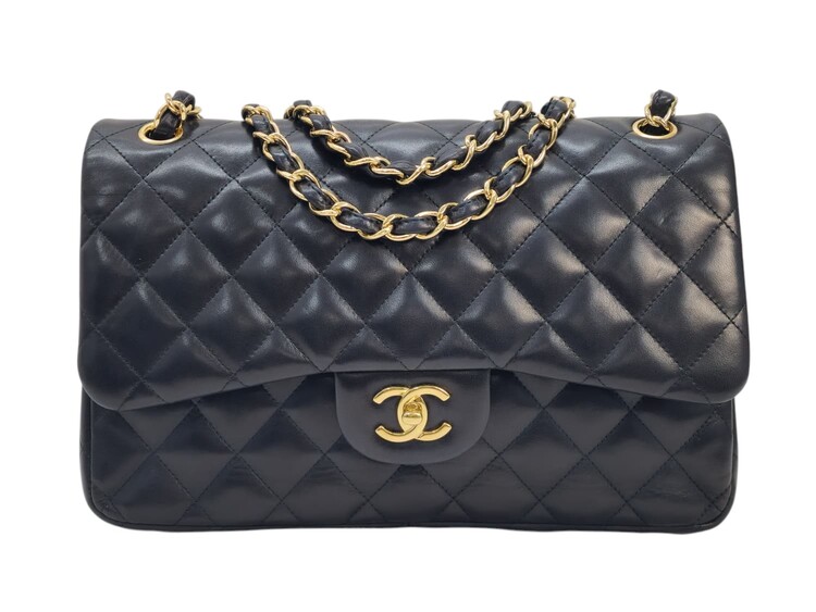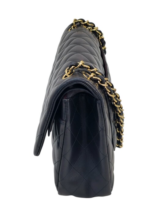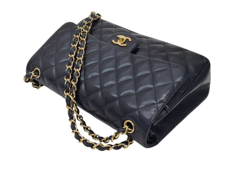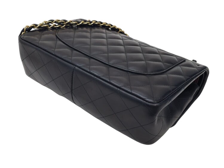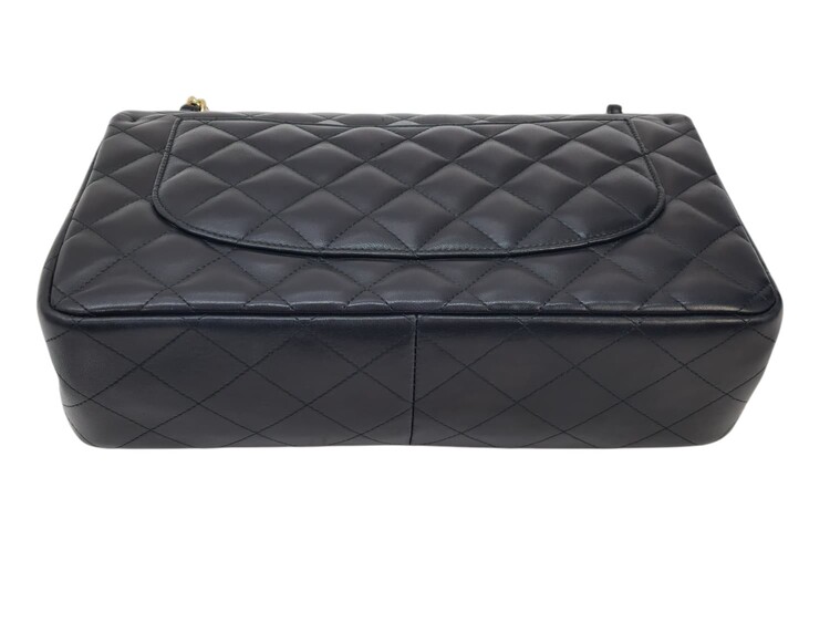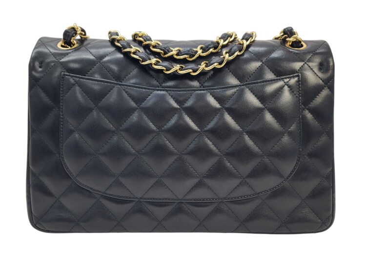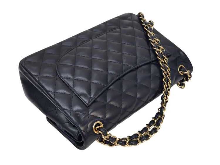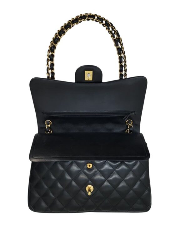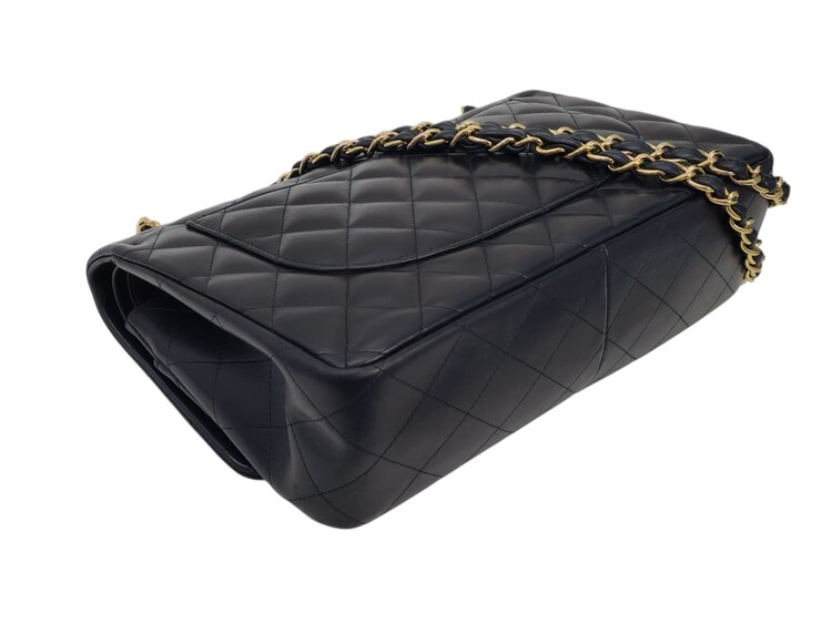 Chanel Timeless Classic double flap jumbo in pelle d’agnello nera, con hardware dorato.