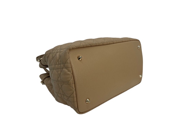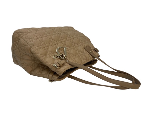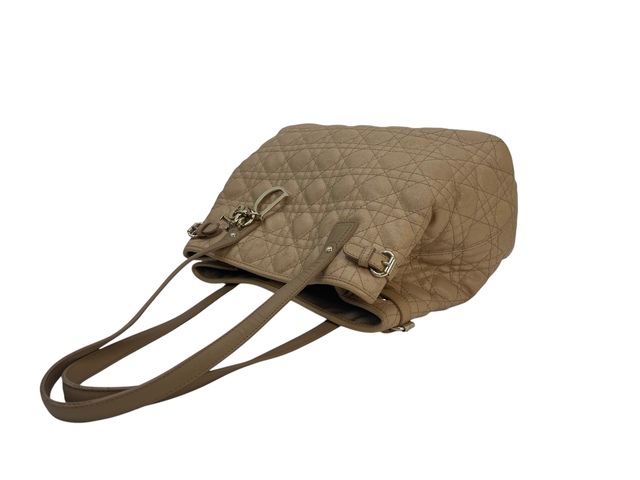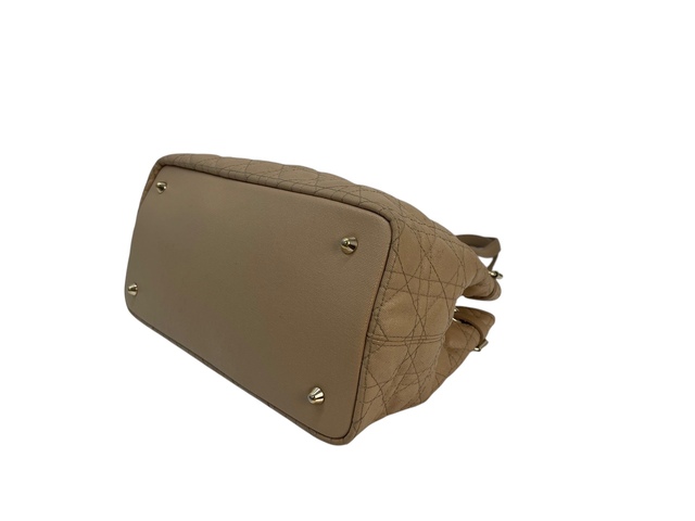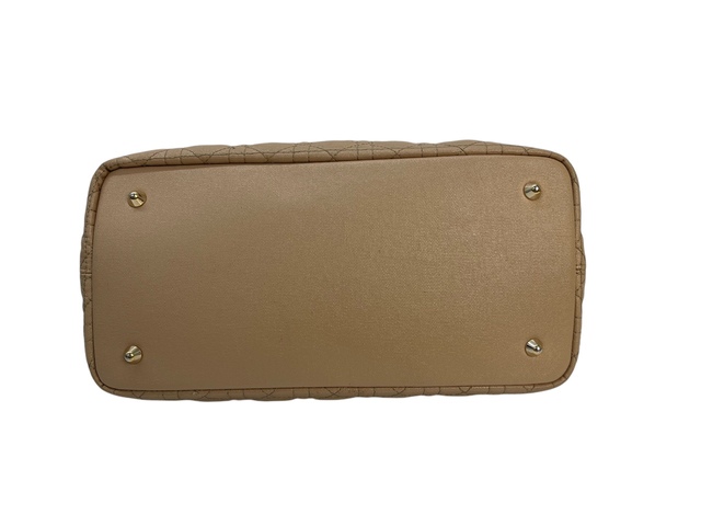 Dior Panarea in tela cannage beige, inserti in metallo light gold, doppio manico in pelle marrone per poter portare la borsa a mano o a spalla.