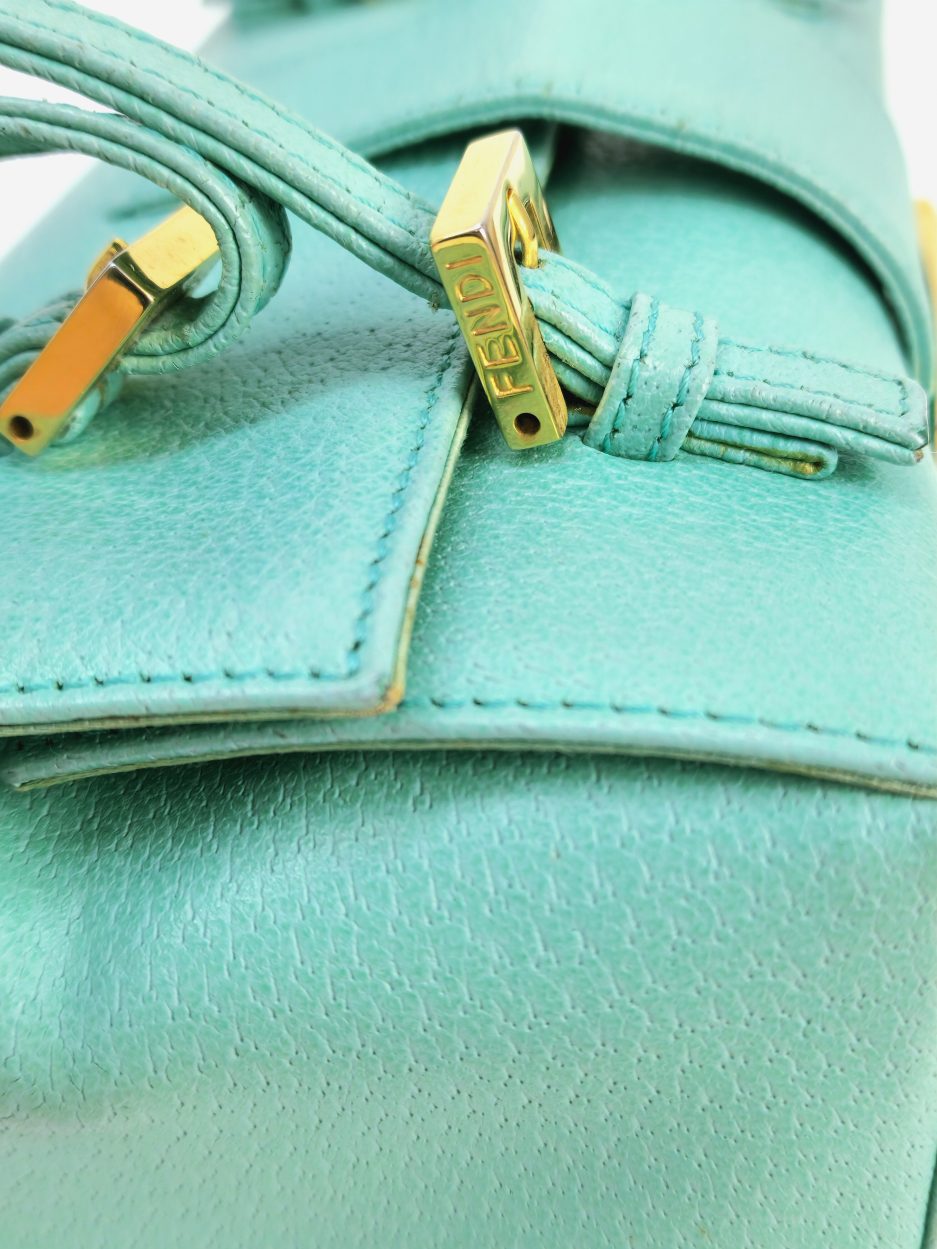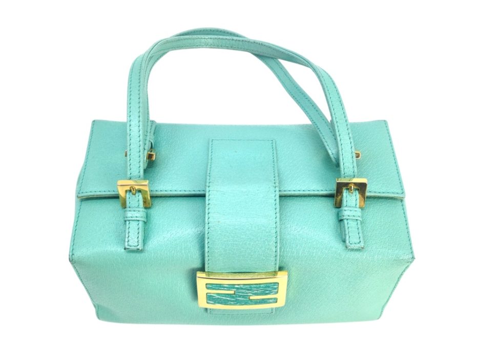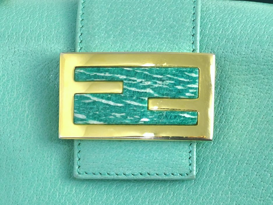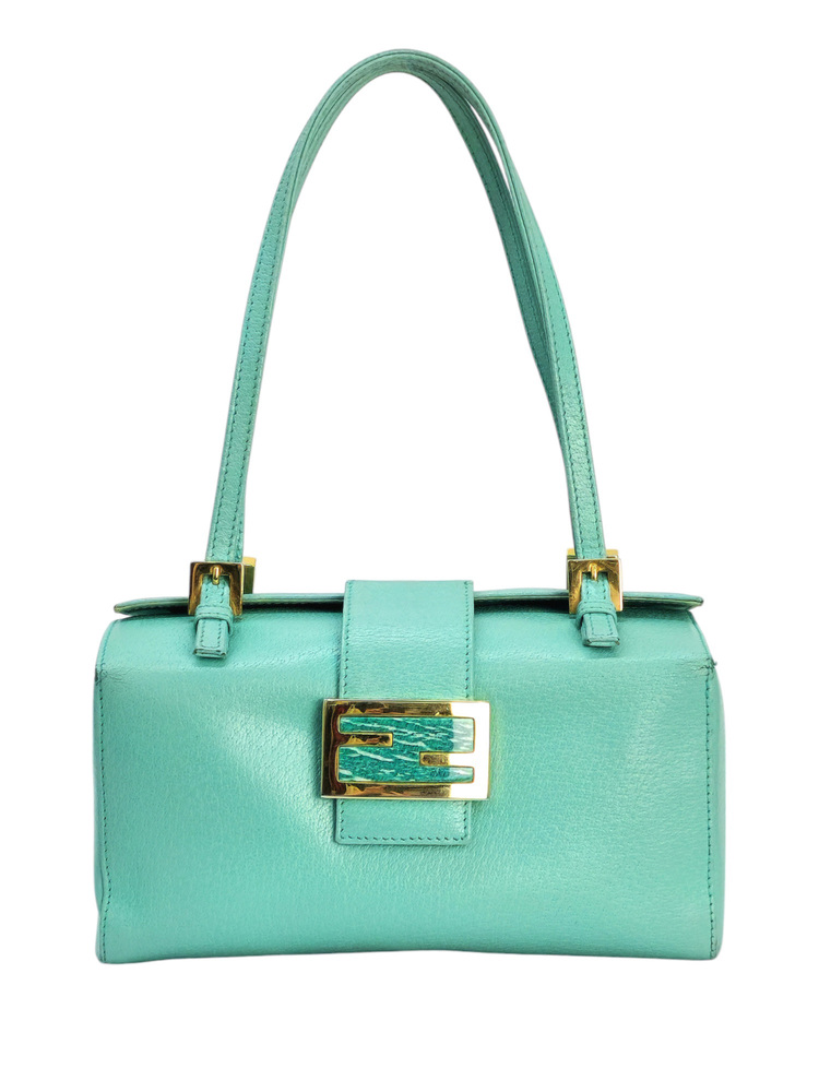 Fendi Baguette boston in pelle di cinghiale turchese. La borsa che richiama il modello iconico della maison Fendi la classica Baguette ma in versione boston quindi bauletto. La borsa ha la fibbia è in marmo
