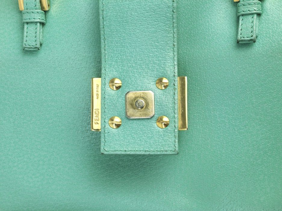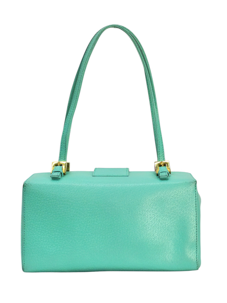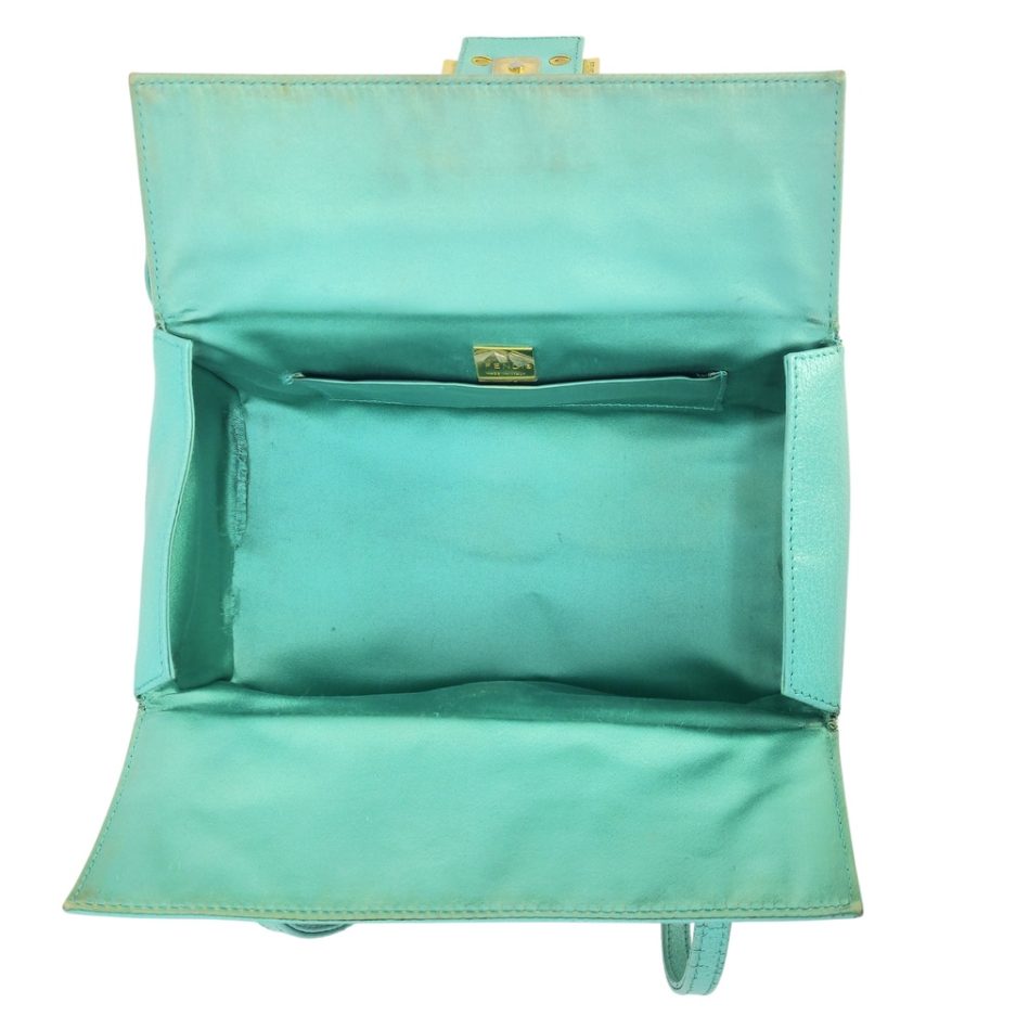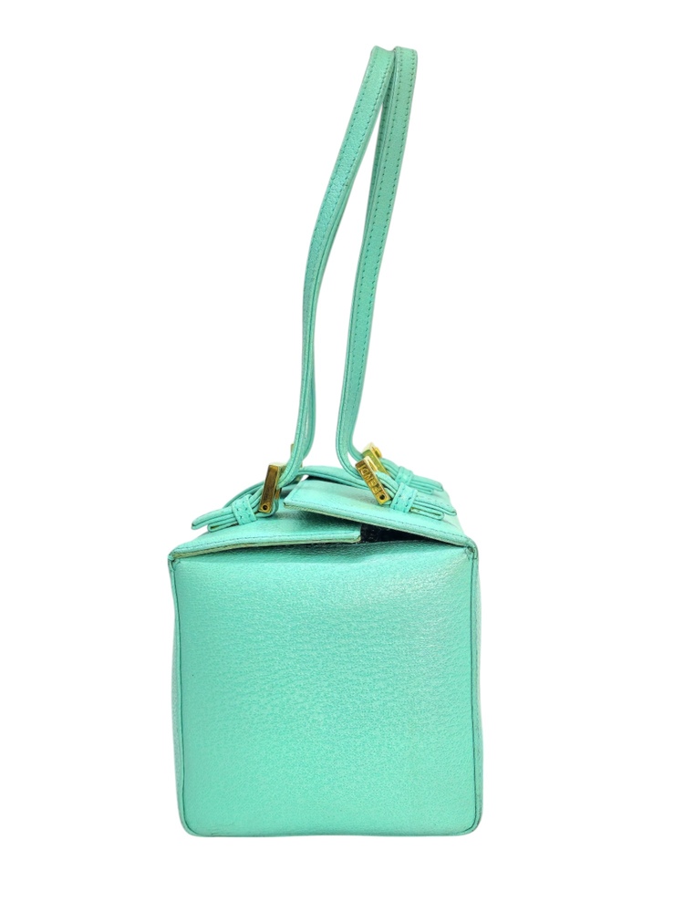 Fendi Baguette boston in pelle di cinghiale turchese. La borsa che richiama il modello iconico della maison Fendi la classica Baguette ma in versione boston quindi bauletto. La borsa ha la fibbia è in marmo