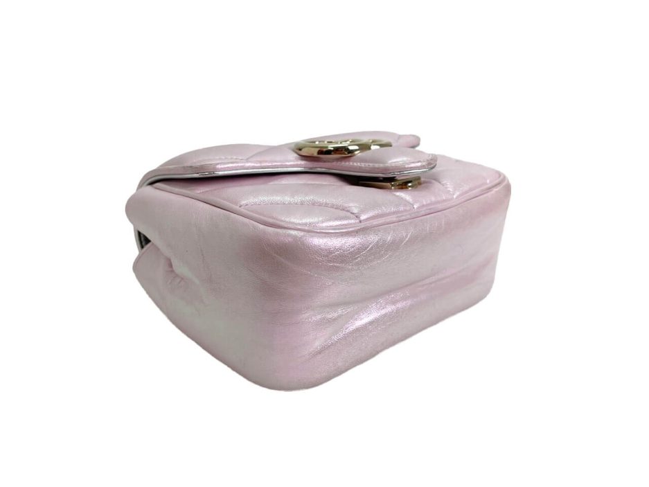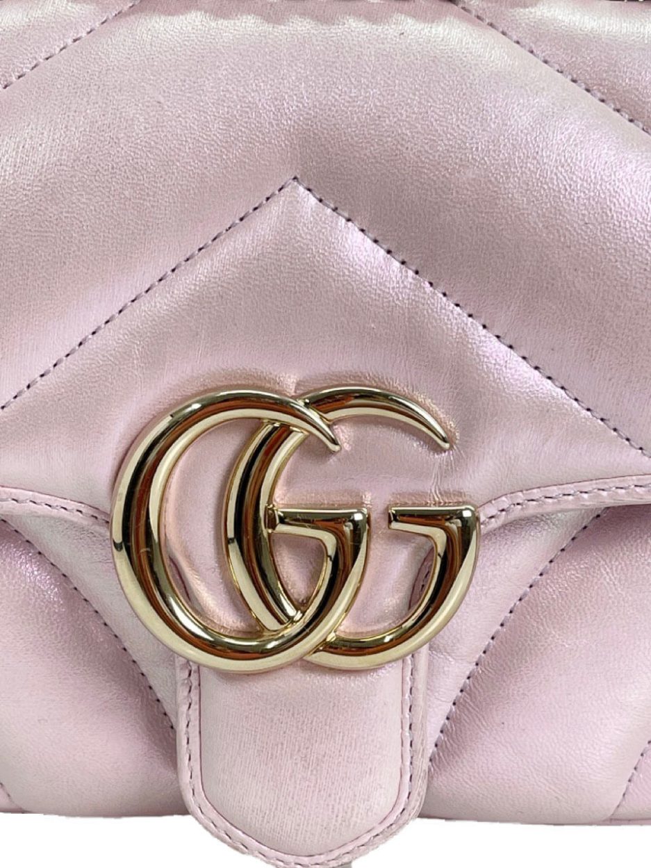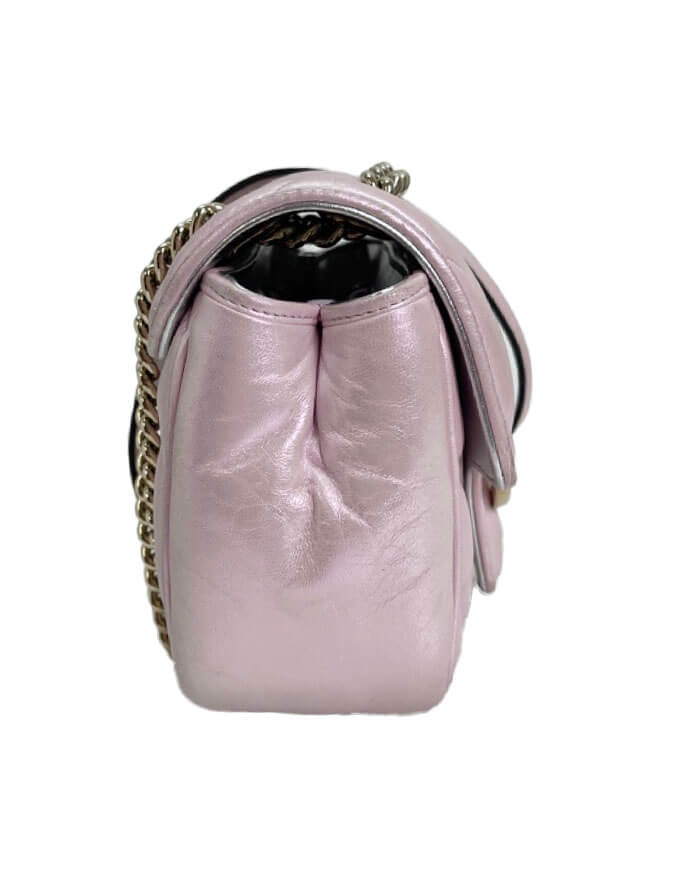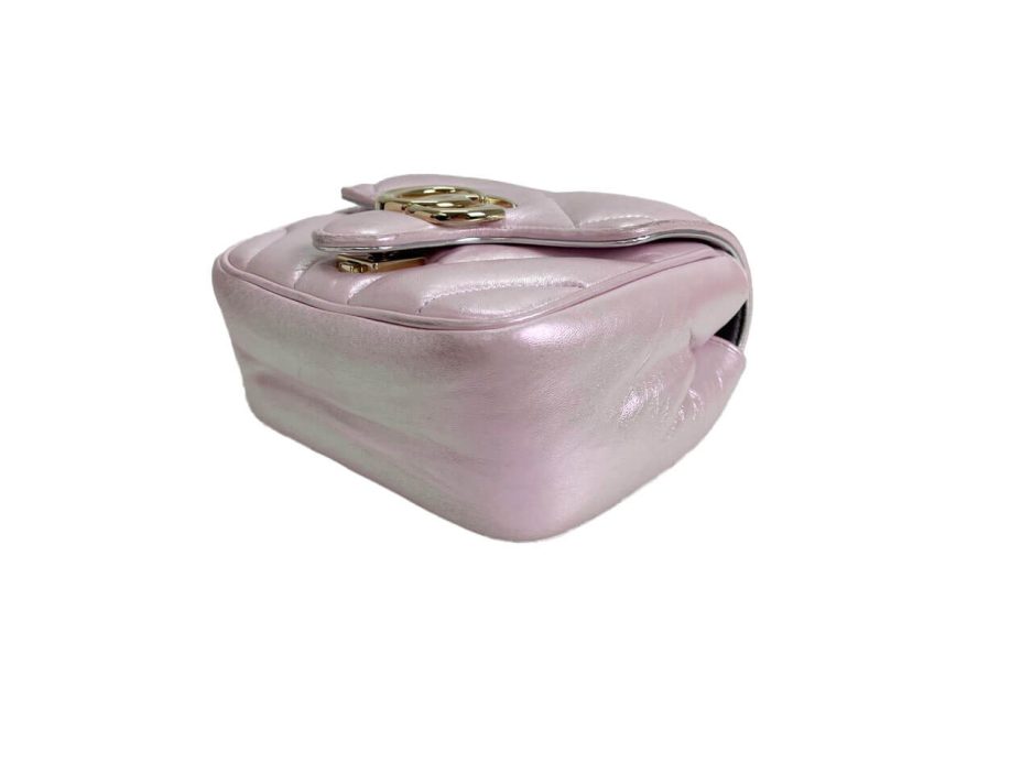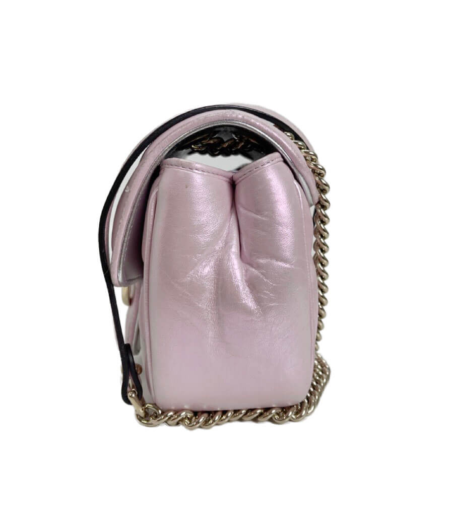 Gucci mini Marmont in pelle puffy rosa iridescente. Ultimo modello della famiglia Marmont nella versione in edizione limitata rosa iridescente con metalleria oro.