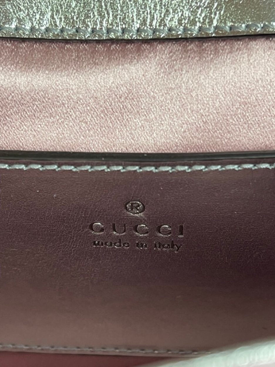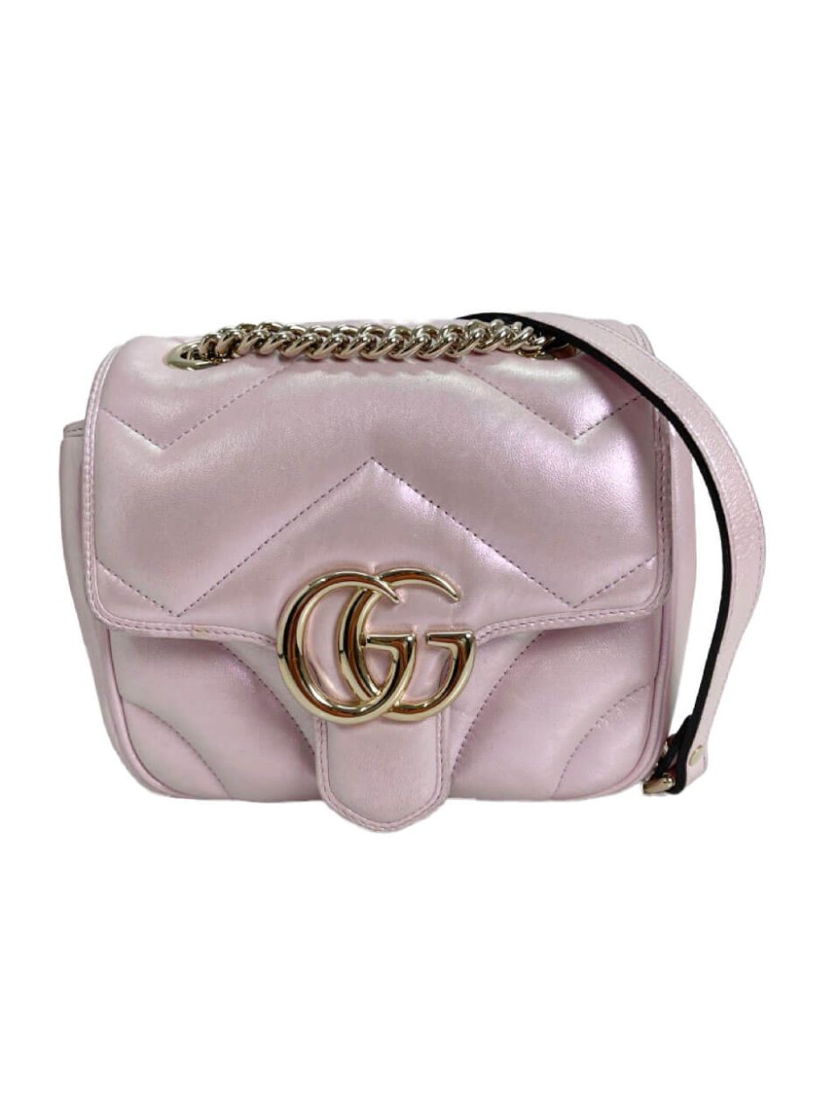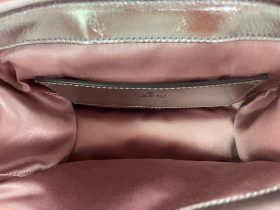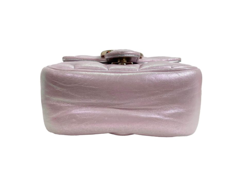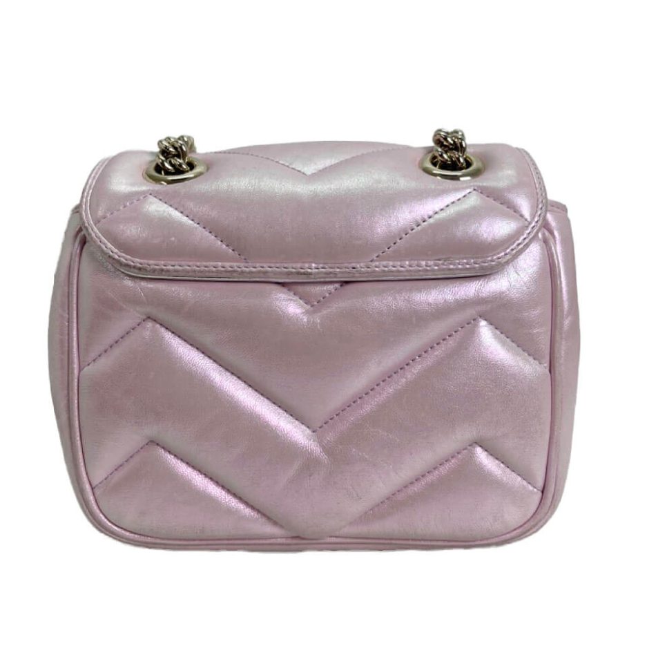 Gucci mini Marmont in pelle puffy rosa iridescente. Ultimo modello della famiglia Marmont nella versione in edizione limitata rosa iridescente con metalleria oro.
