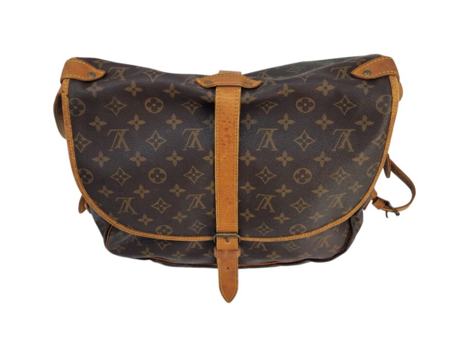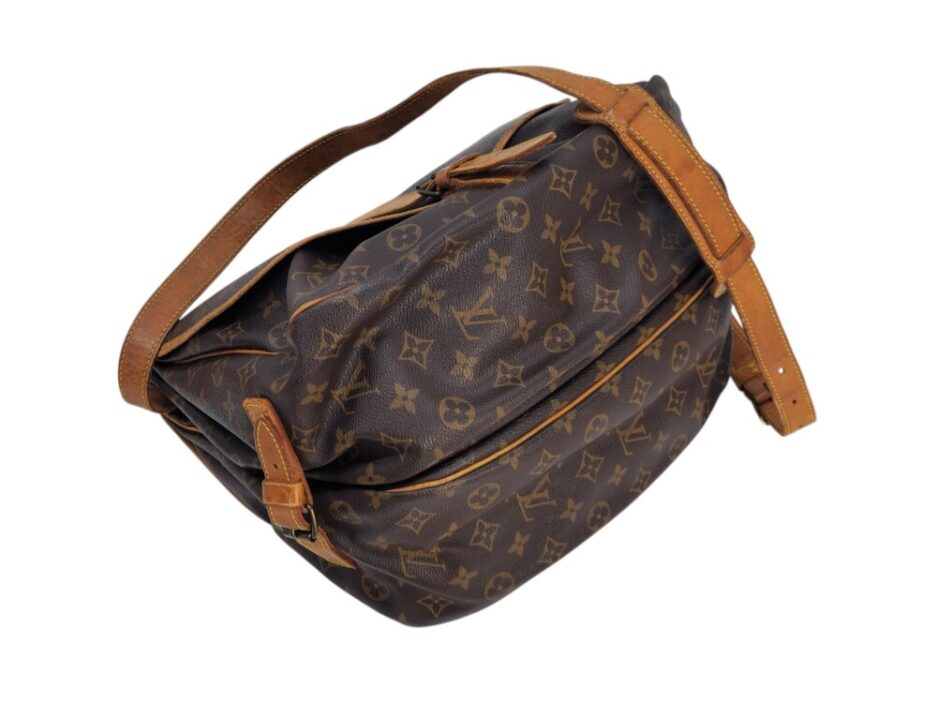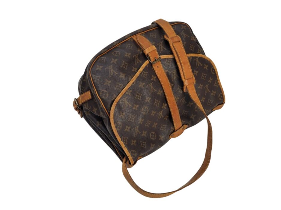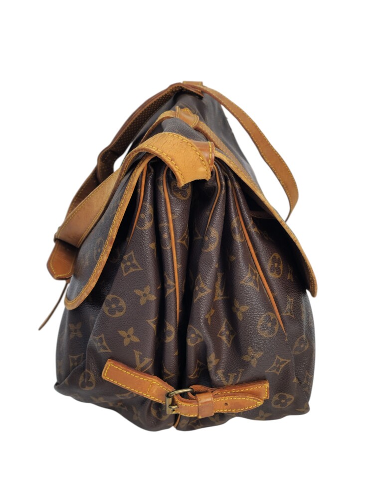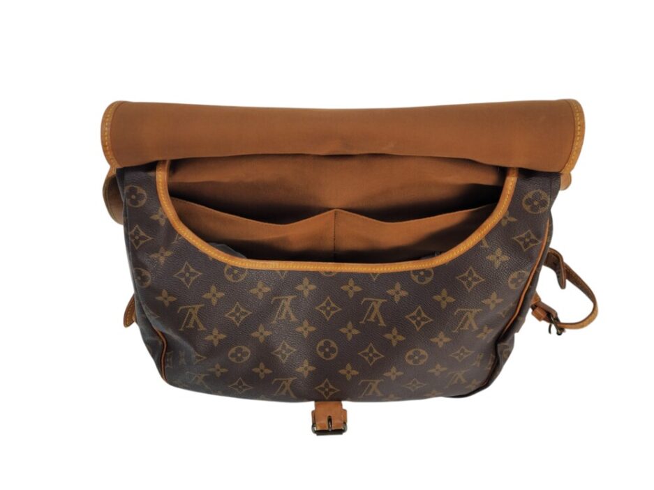 Louis Vuitton Saumur MM in tela monogram con rifiniture in vacchetta naturale. Una borsa pratica che permette di essere utilizzata da entrambe le parti.