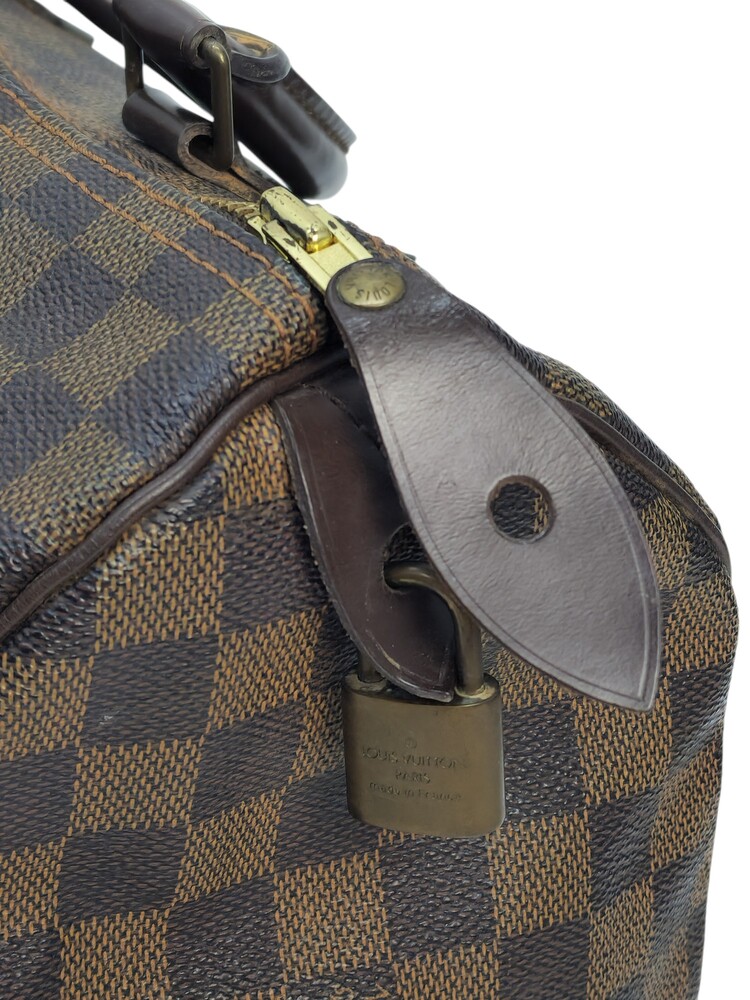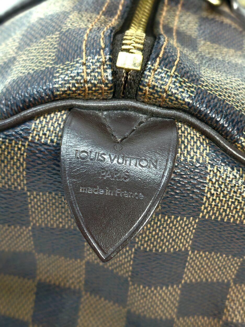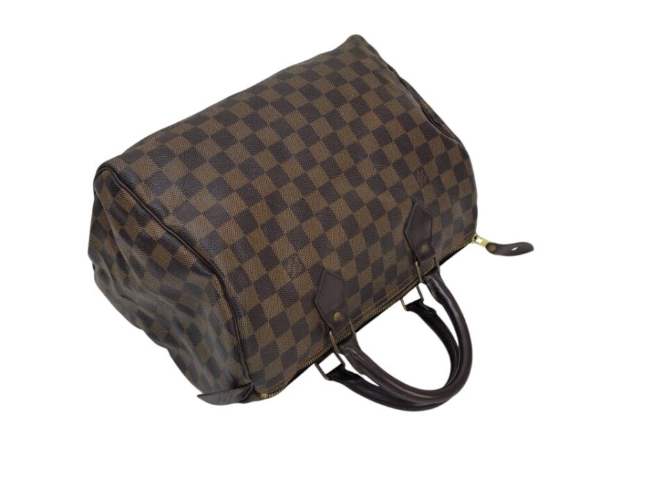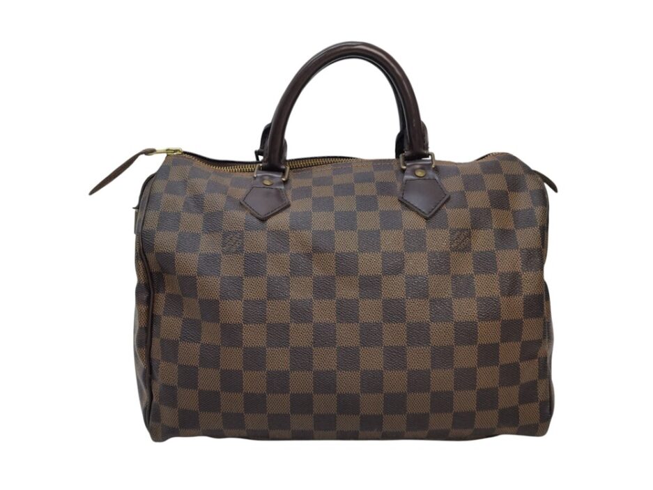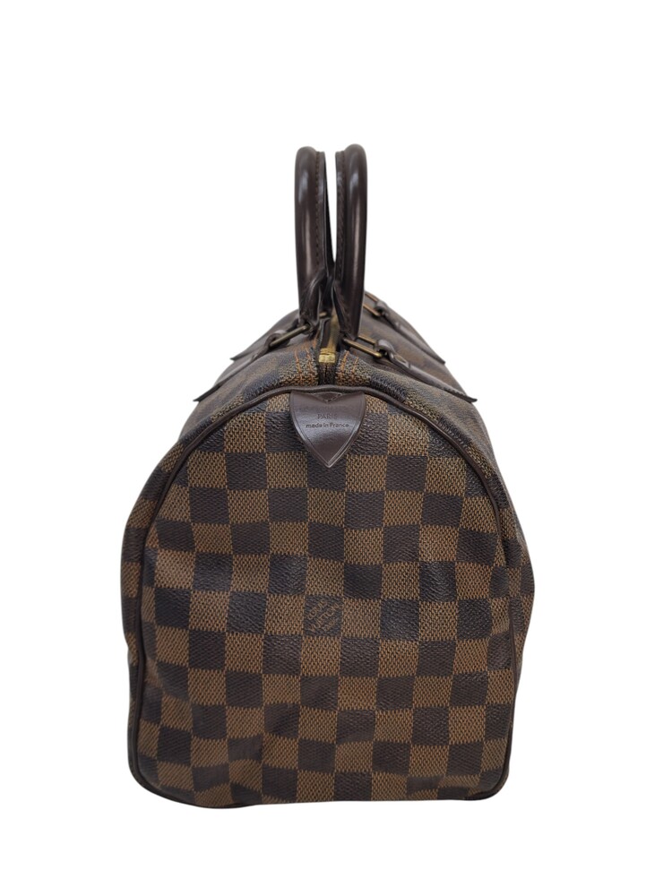 Louis Vuitton Speedy 30 in tela Damier marrone e rifiniture in pelle nella stessa colorazione.