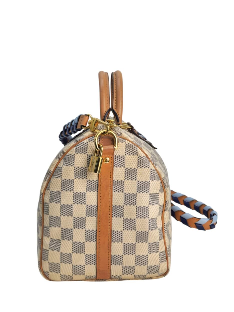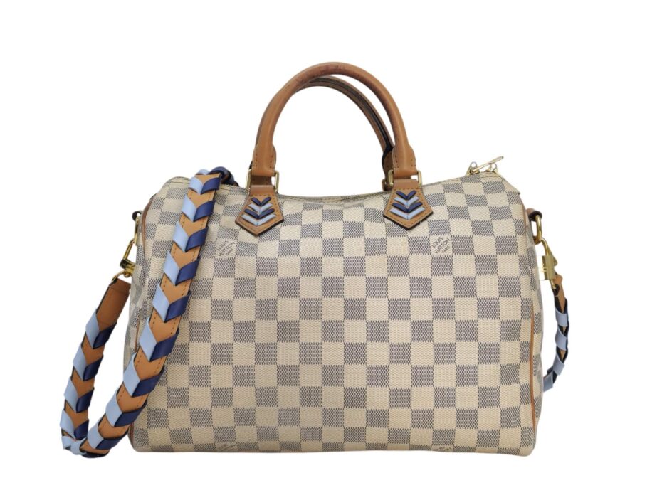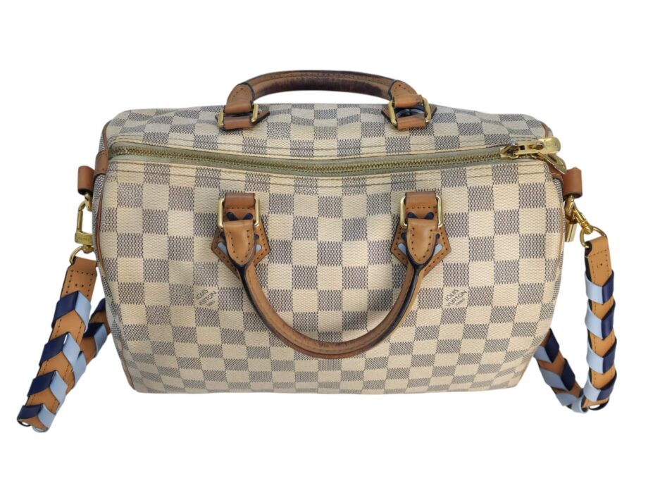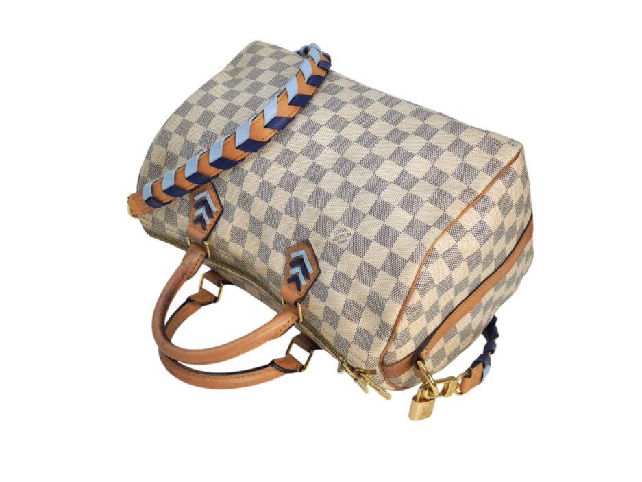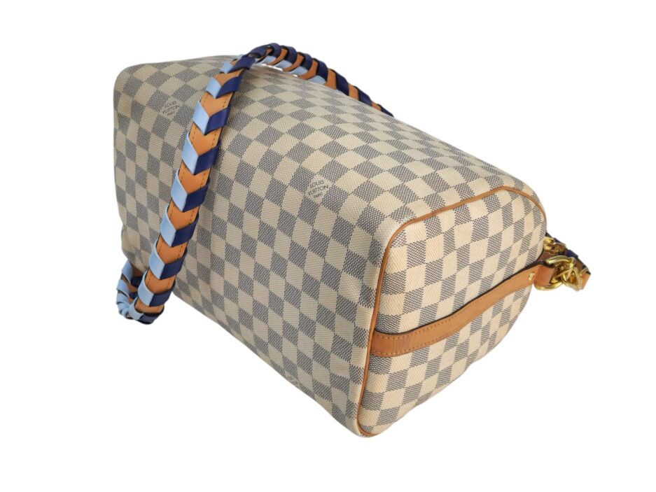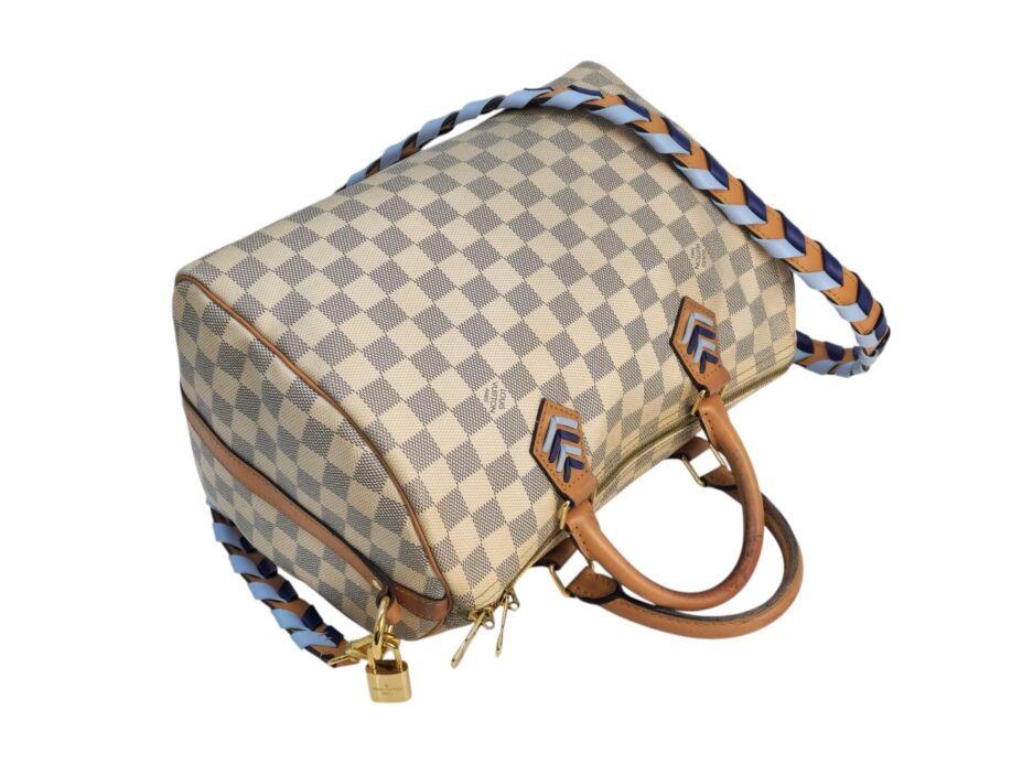 Louis Vuitton Damier Azur Braided Speedy Bandouliere 30. Questa elegante borsa è realizzata in tela Damier a scacchi firmata nei toni del blu e del bianco. La borsa presenta manici superiori in pelle arrotolata, una tracolla in pelle opzionale, finiture in pelle e finiture in ottone lucido. La cerniera superiore si apre su un interno in tessuto blu con una tasca pendente.