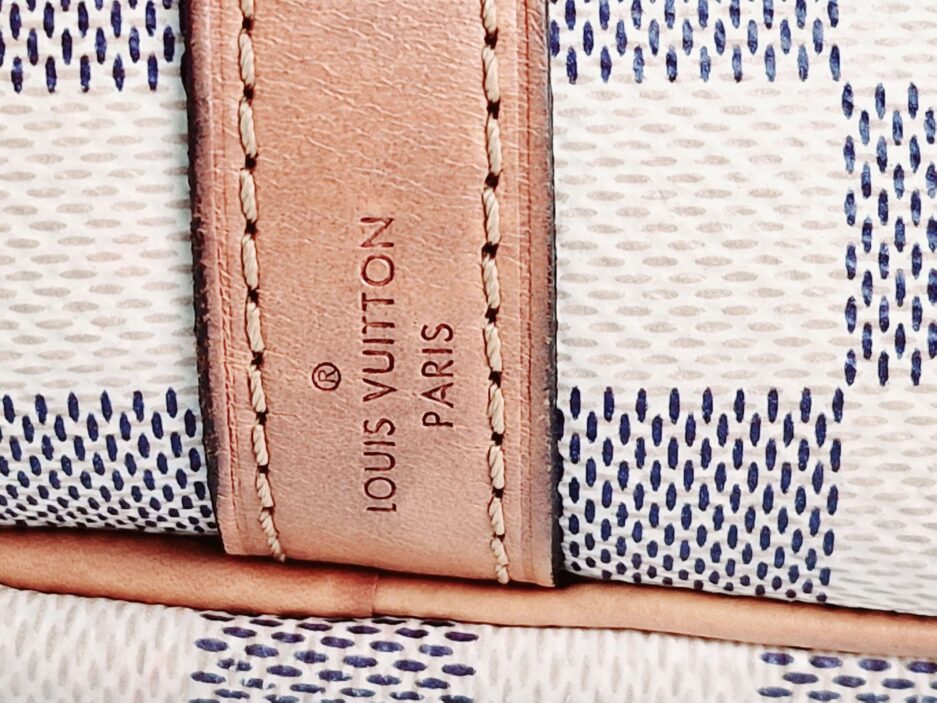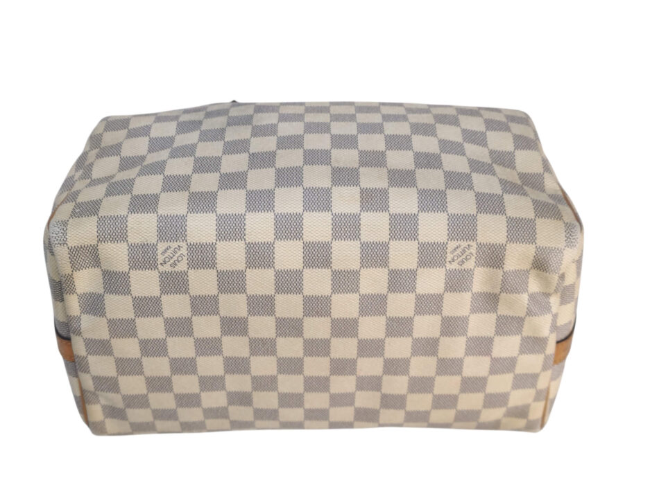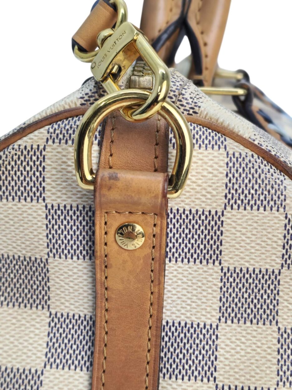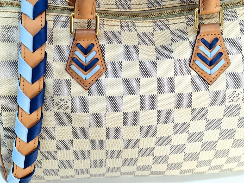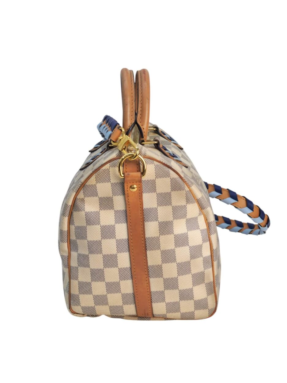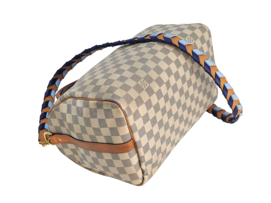 Louis Vuitton Damier Azur Braided Speedy Bandouliere 30. Questa elegante borsa è realizzata in tela Damier a scacchi firmata nei toni del blu e del bianco. La borsa presenta manici superiori in pelle arrotolata, una tracolla in pelle opzionale, finiture in pelle e finiture in ottone lucido. La cerniera superiore si apre su un interno in tessuto blu con una tasca pendente.