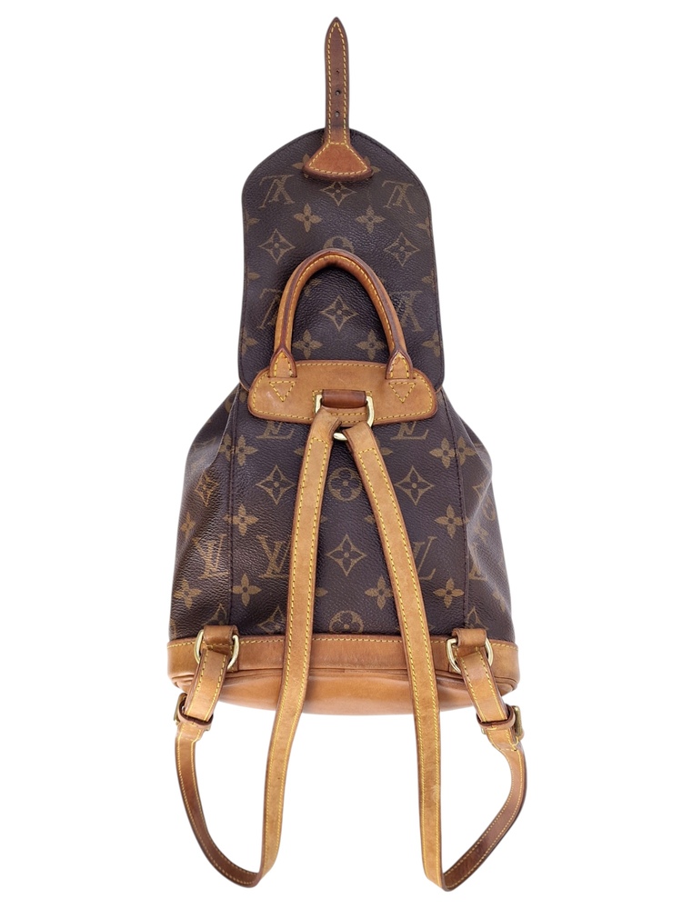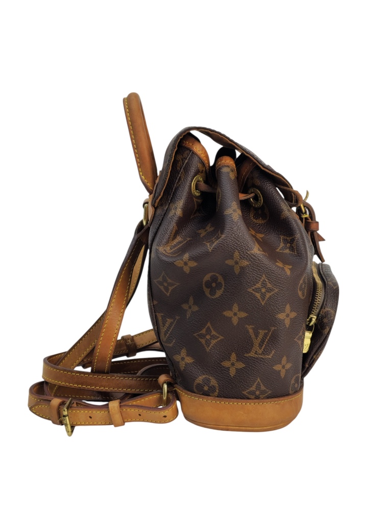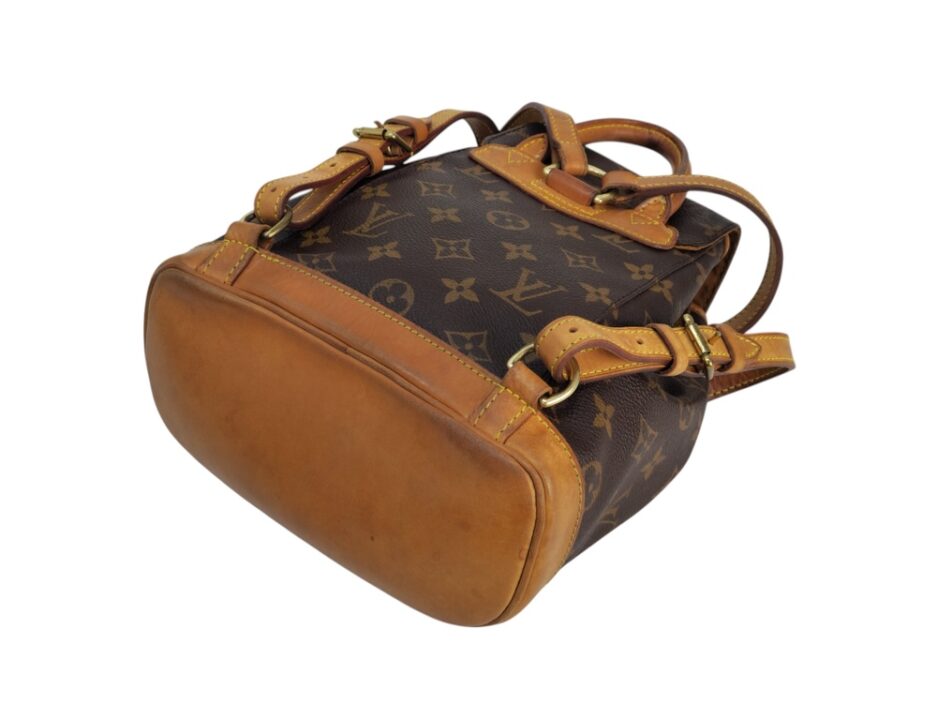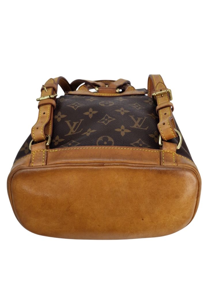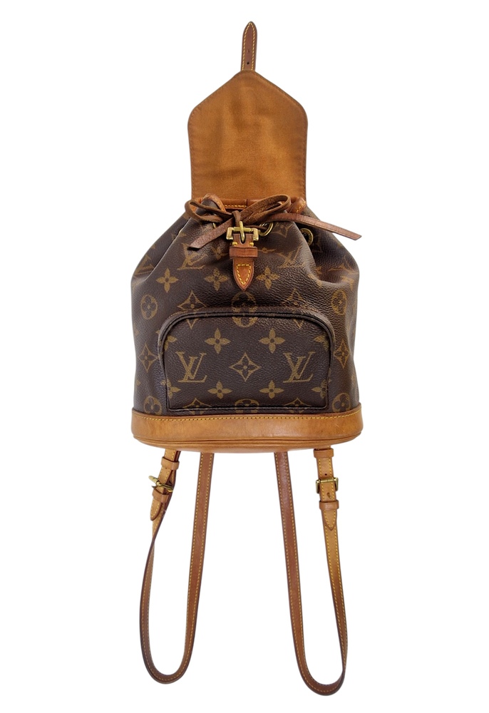 Louis Vuitton zaino Montsouris Mini. L’esclusivo modello, realizzato in tela Monogram, presenta raffinate finiture in vacchetta. Il manico superiore in pelle e le due bretelle regolabili offrono varie possibilità di trasporto.