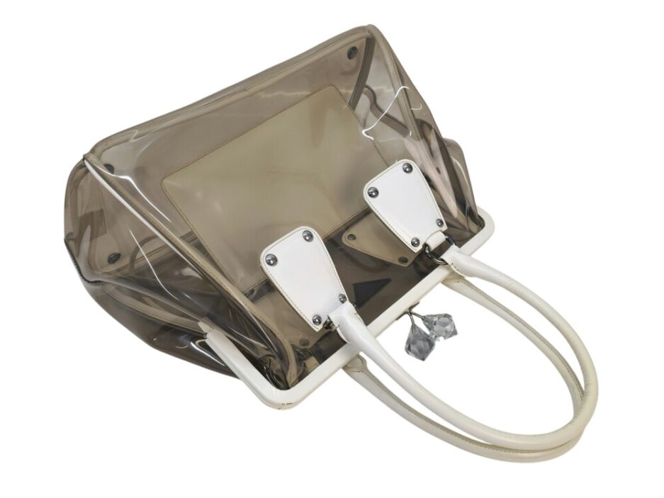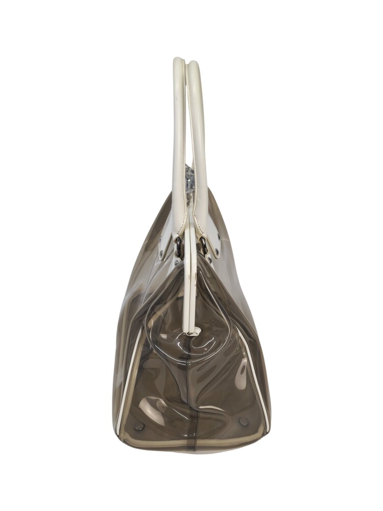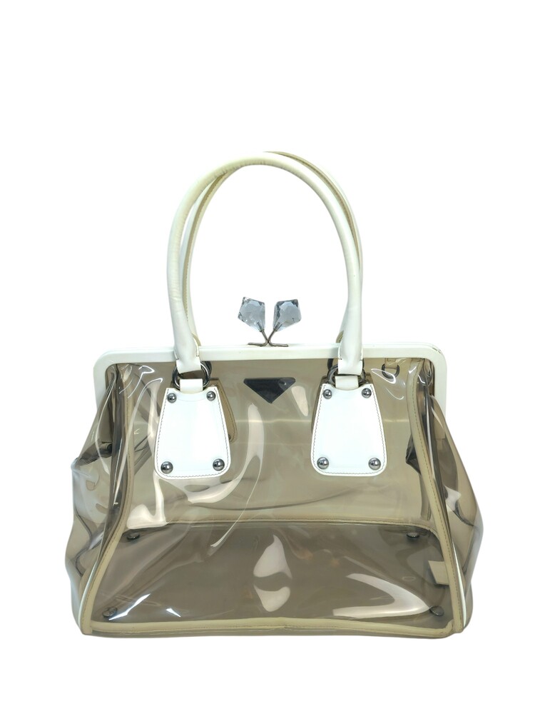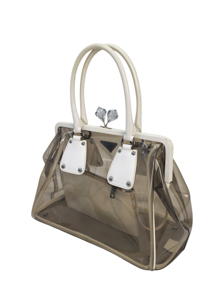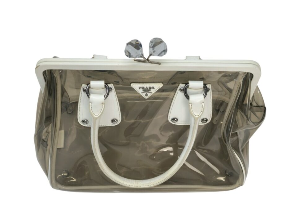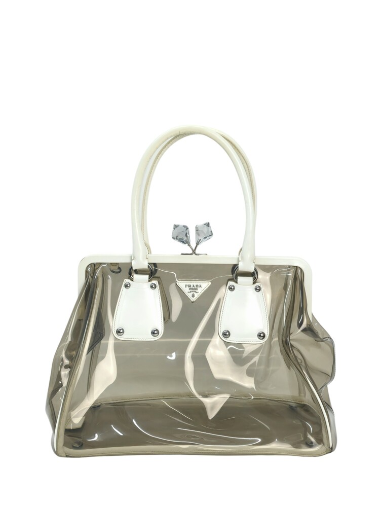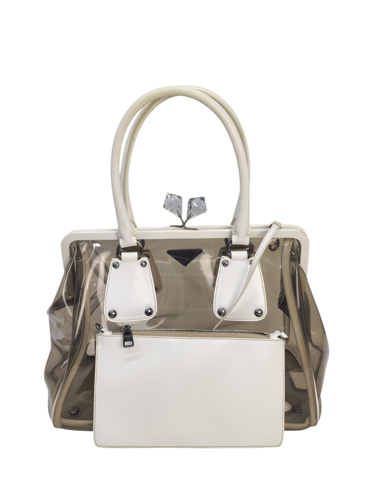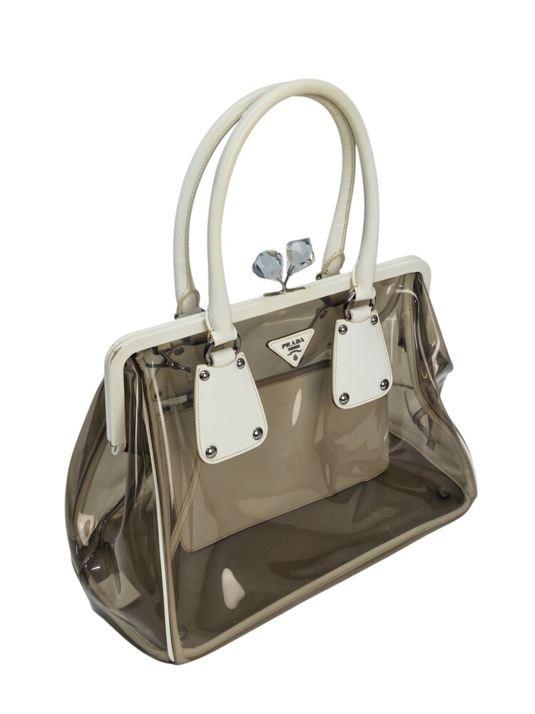 Prada borsa in plastica trasparente con dettaglio chiusura a fermaglio in cristallo e manico in pelle bianca.