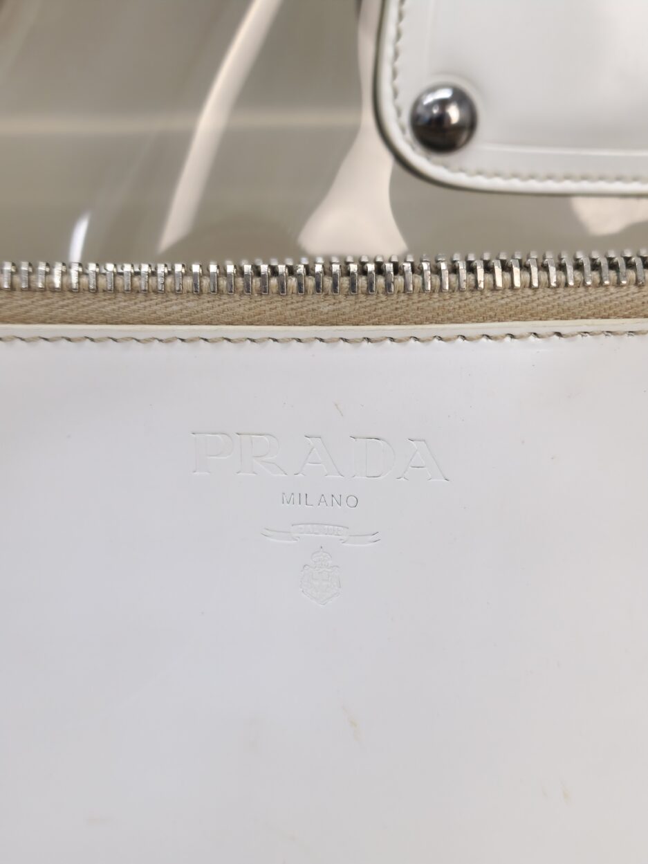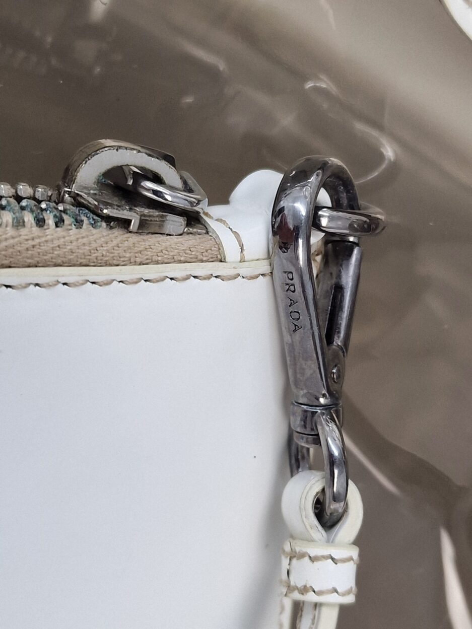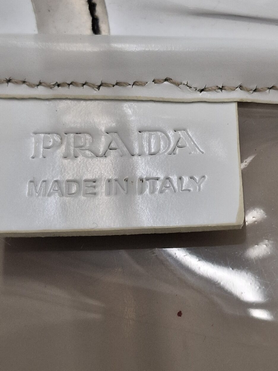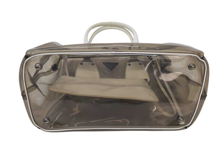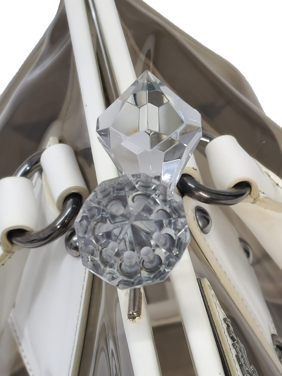 Prada borsa in plastica trasparente con dettaglio chiusura a fermaglio in cristallo e manico in pelle bianca.
