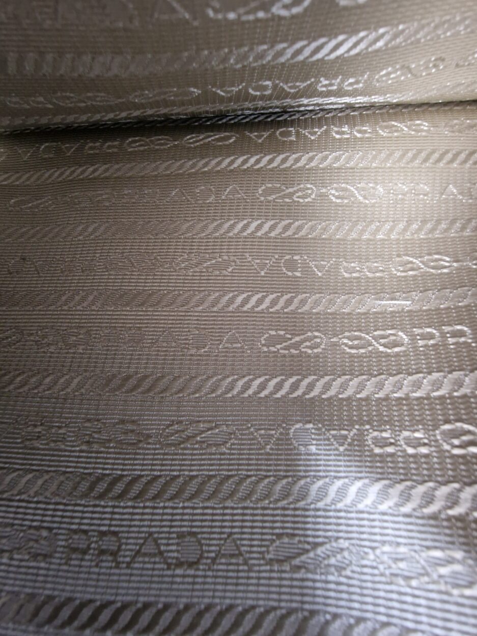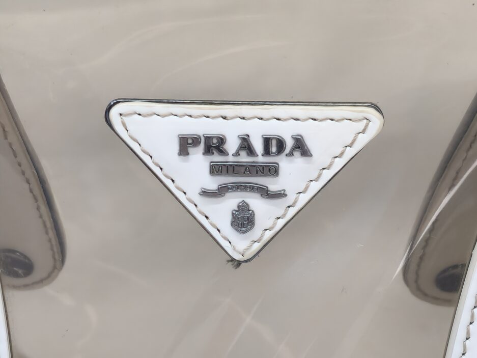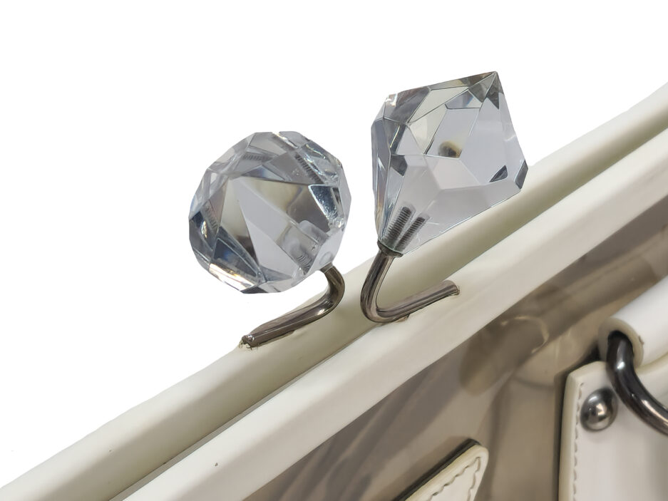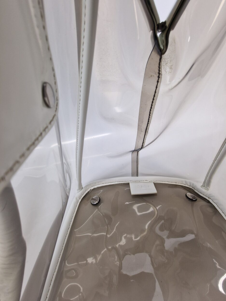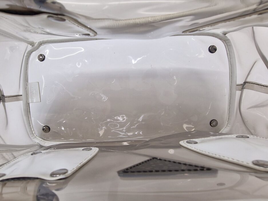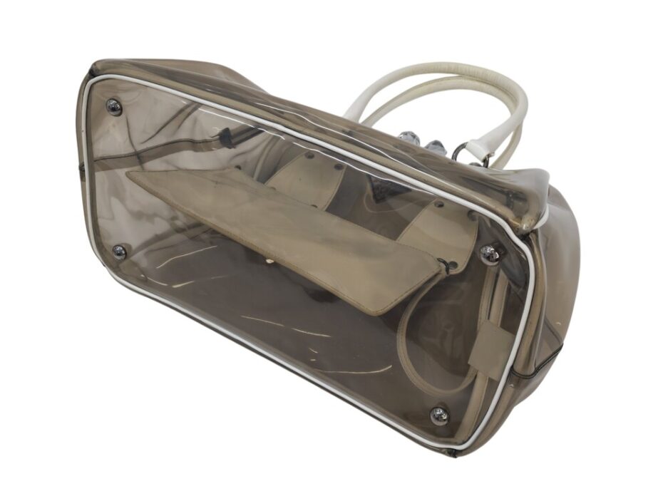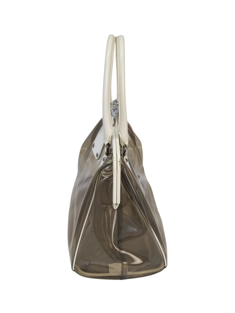 Prada borsa in plastica trasparente con dettaglio chiusura a fermaglio in cristallo e manico in pelle bianca.