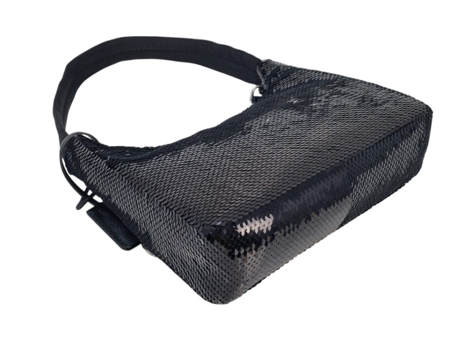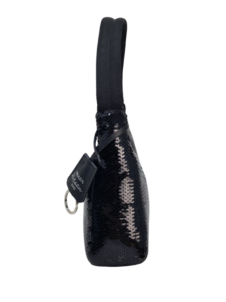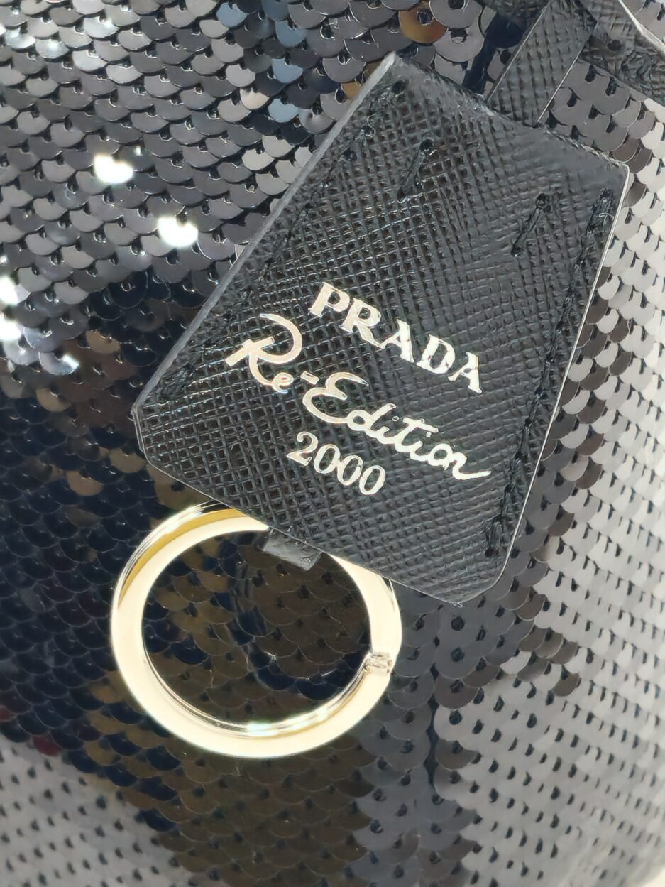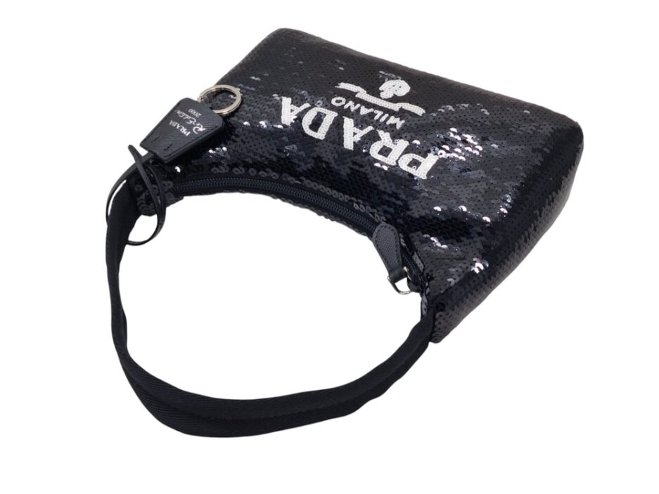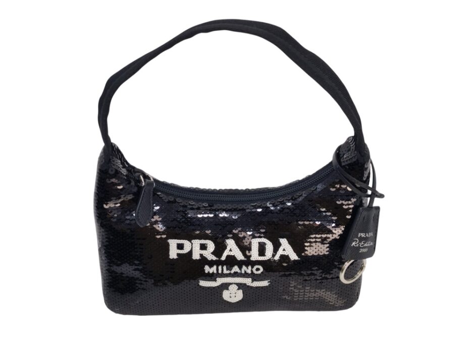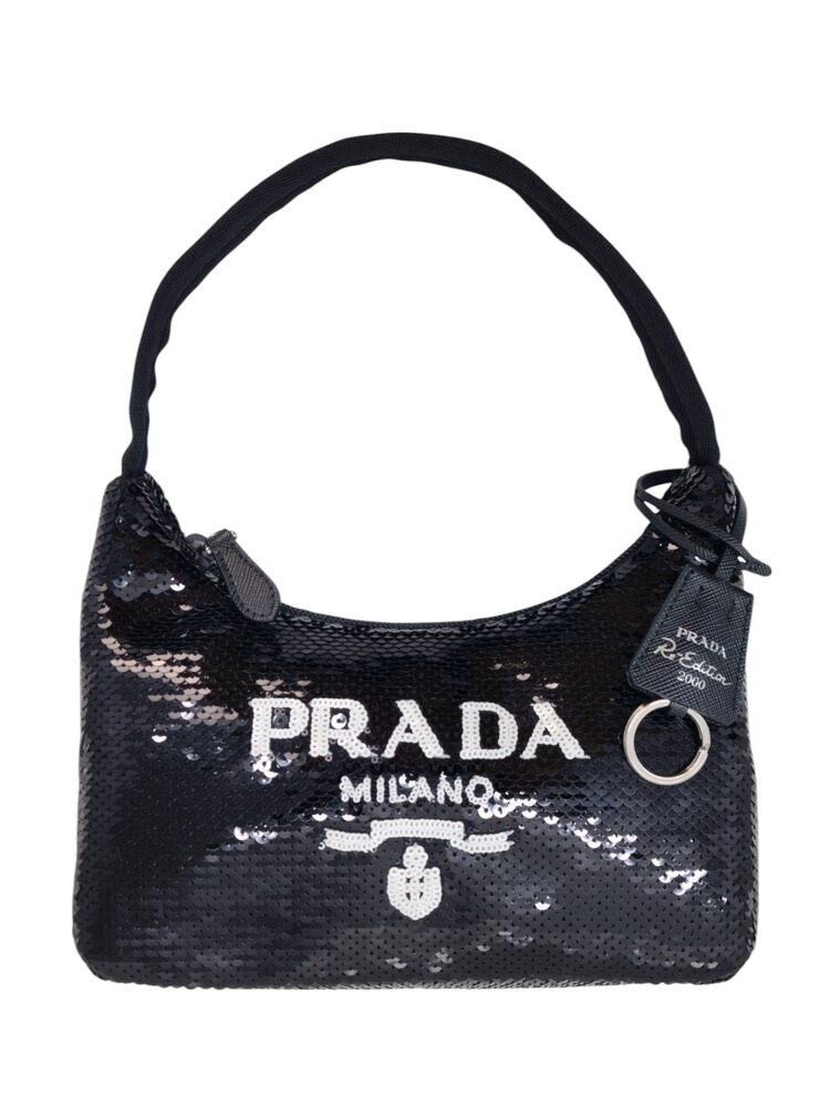 Prada Re-Edition in Re-Nylon con pailettes. Caratteristico logo Prada posto su parte frontale bianco. Munita di manico superiore in nastro per trasportarla comodamente a spalla, braccio o mano. Chiusura superiore con cerniera. Portachiavi logato amovibile. Interno foderato in tessuto logato.