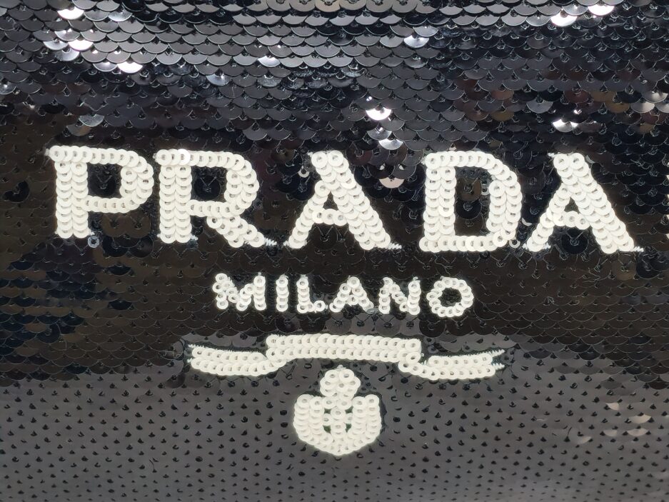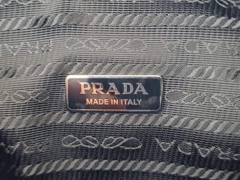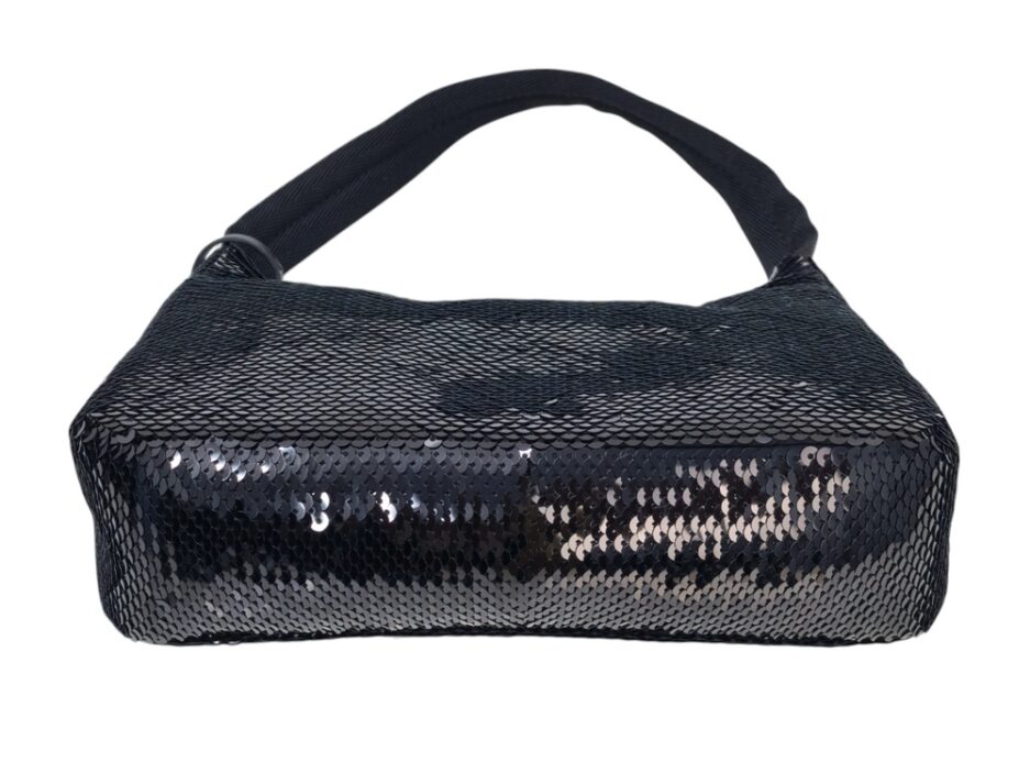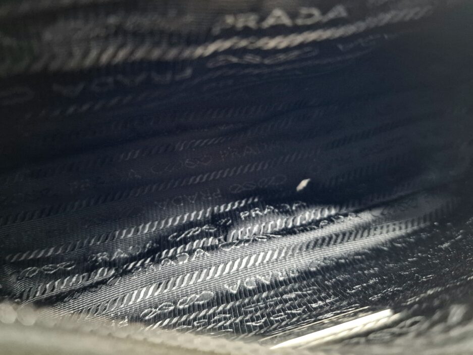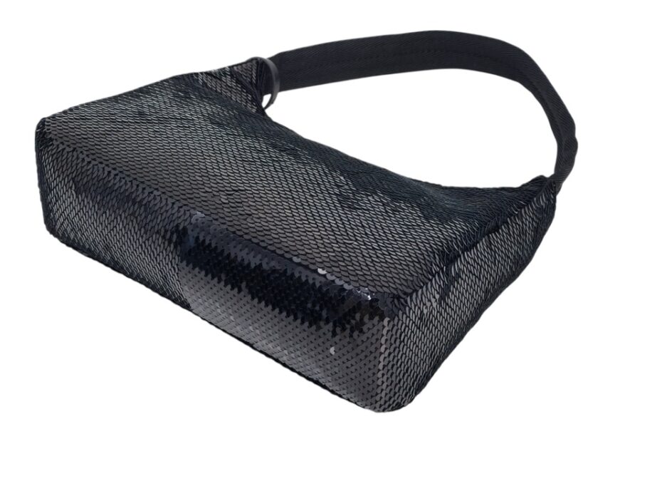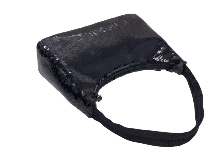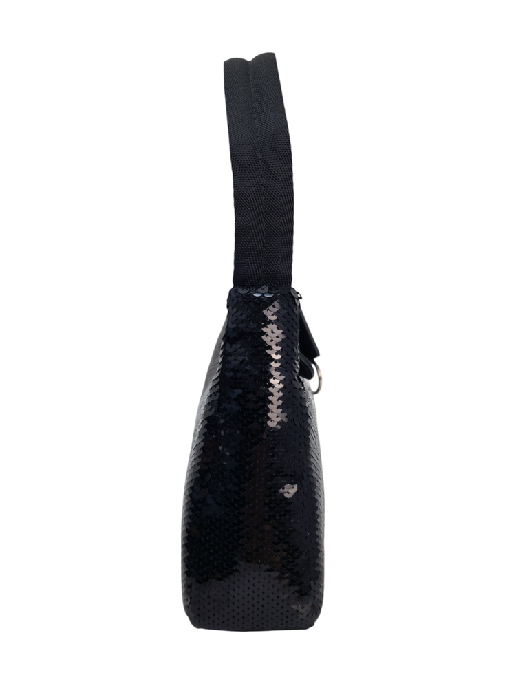 Prada Re-Edition in Re-Nylon con pailettes. Caratteristico logo Prada posto su parte frontale bianco. Munita di manico superiore in nastro per trasportarla comodamente a spalla, braccio o mano. Chiusura superiore con cerniera. Portachiavi logato amovibile. Interno foderato in tessuto logato.