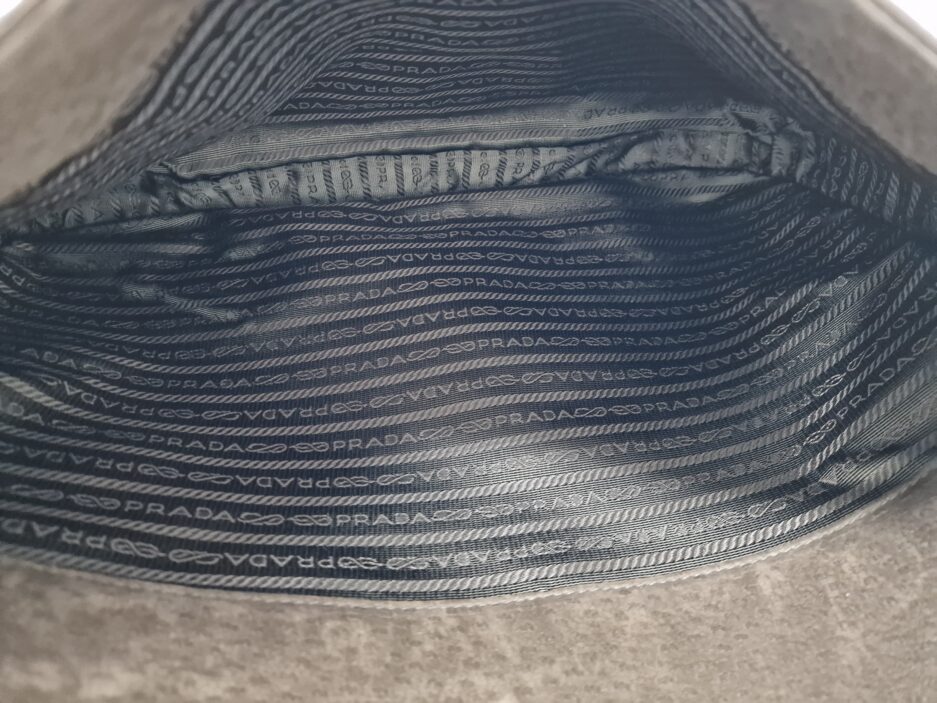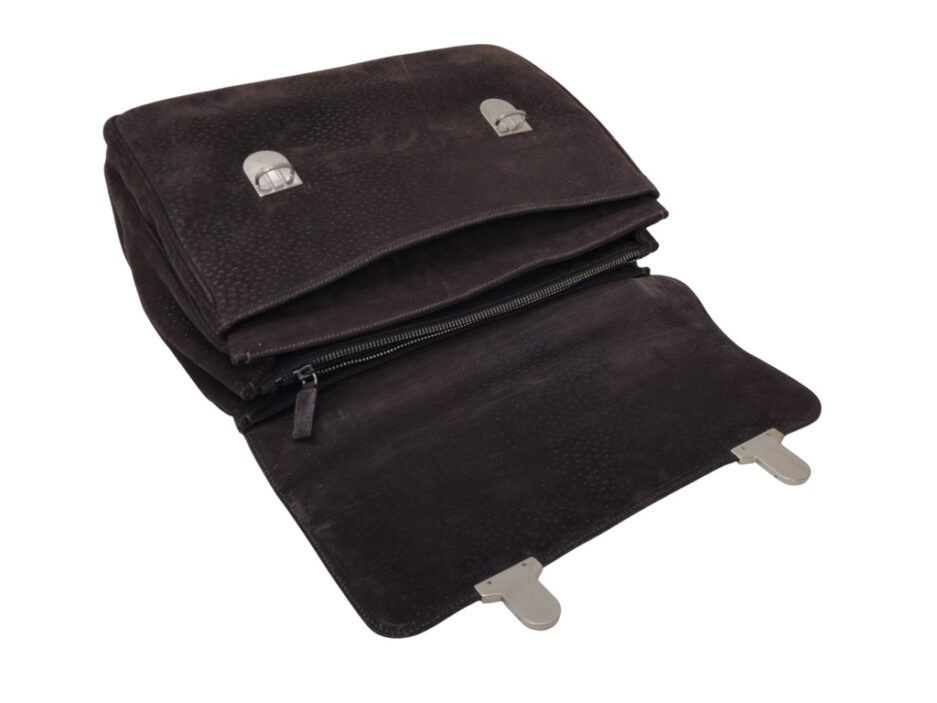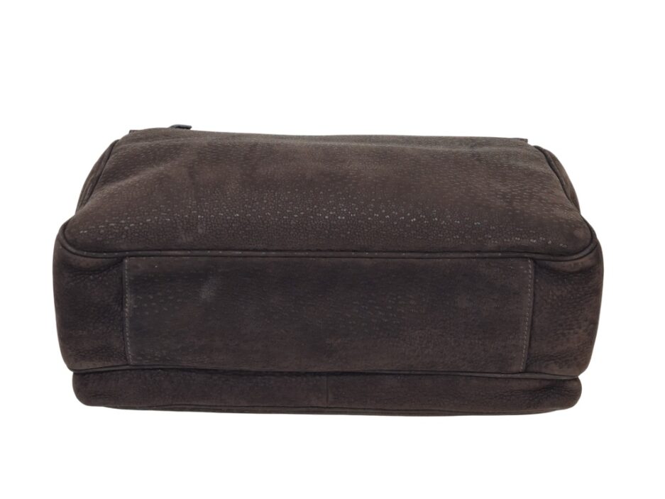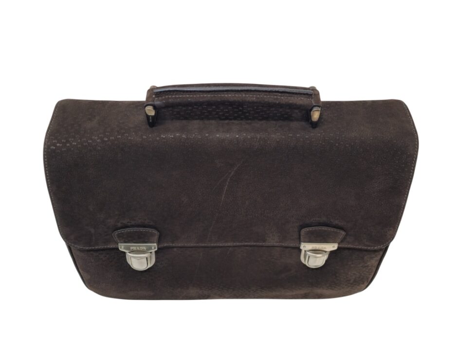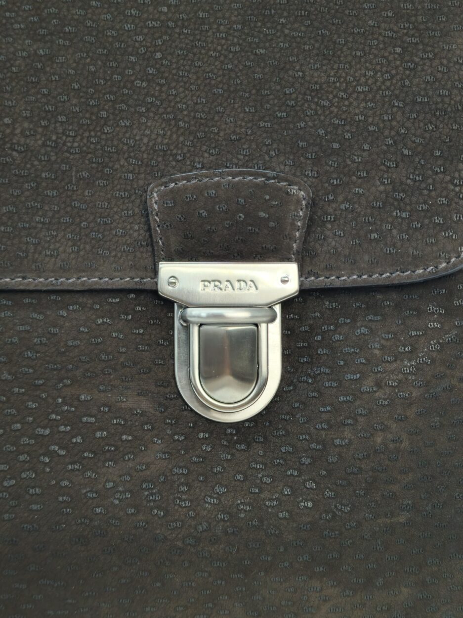 Prada Cartella da lavoro in pelle scamosciata con manico tono su tono, quattro scomparti anteriori ed uno posteriore e rifiniture in metallo argentato.