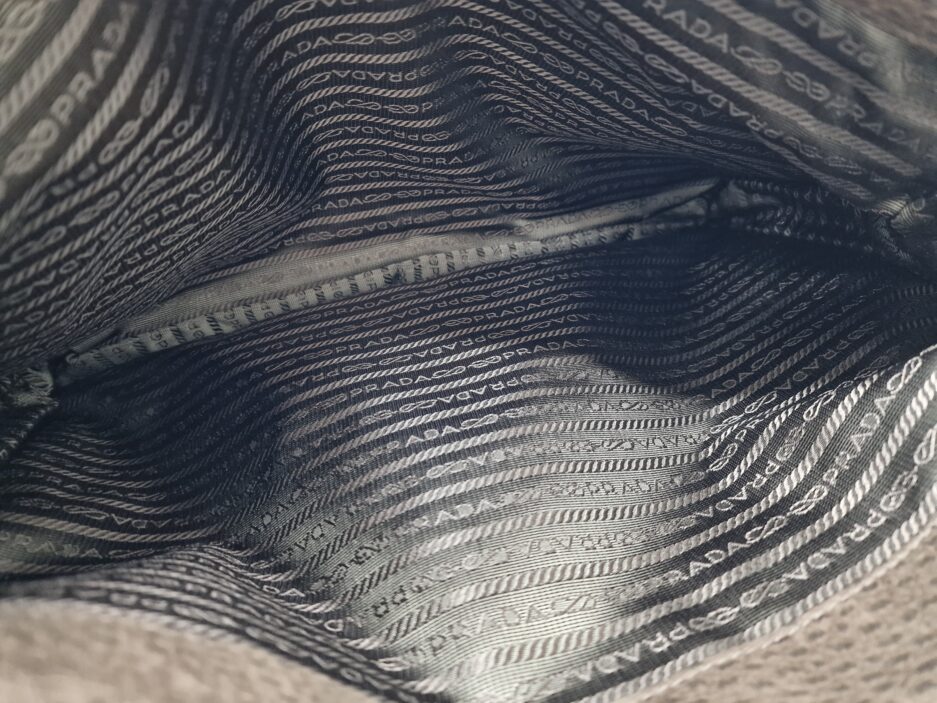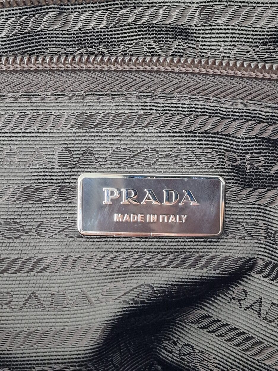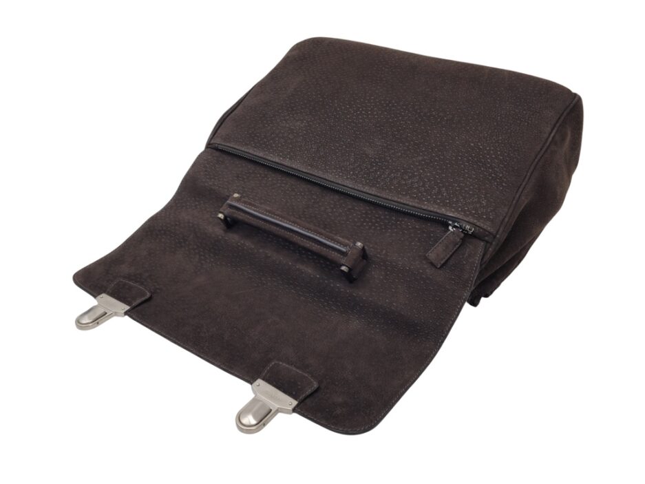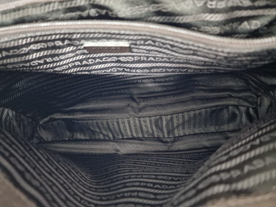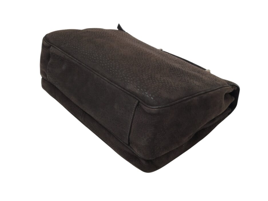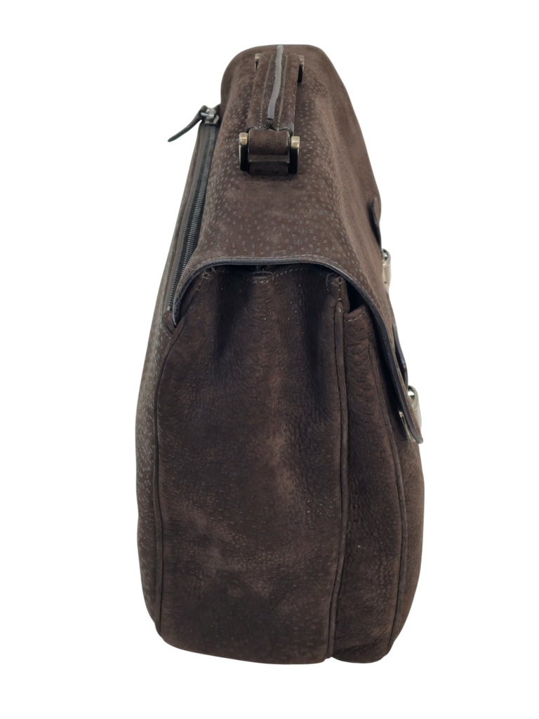 Prada Cartella da lavoro in pelle scamosciata con manico tono su tono, quattro scomparti anteriori ed uno posteriore e rifiniture in metallo argentato.